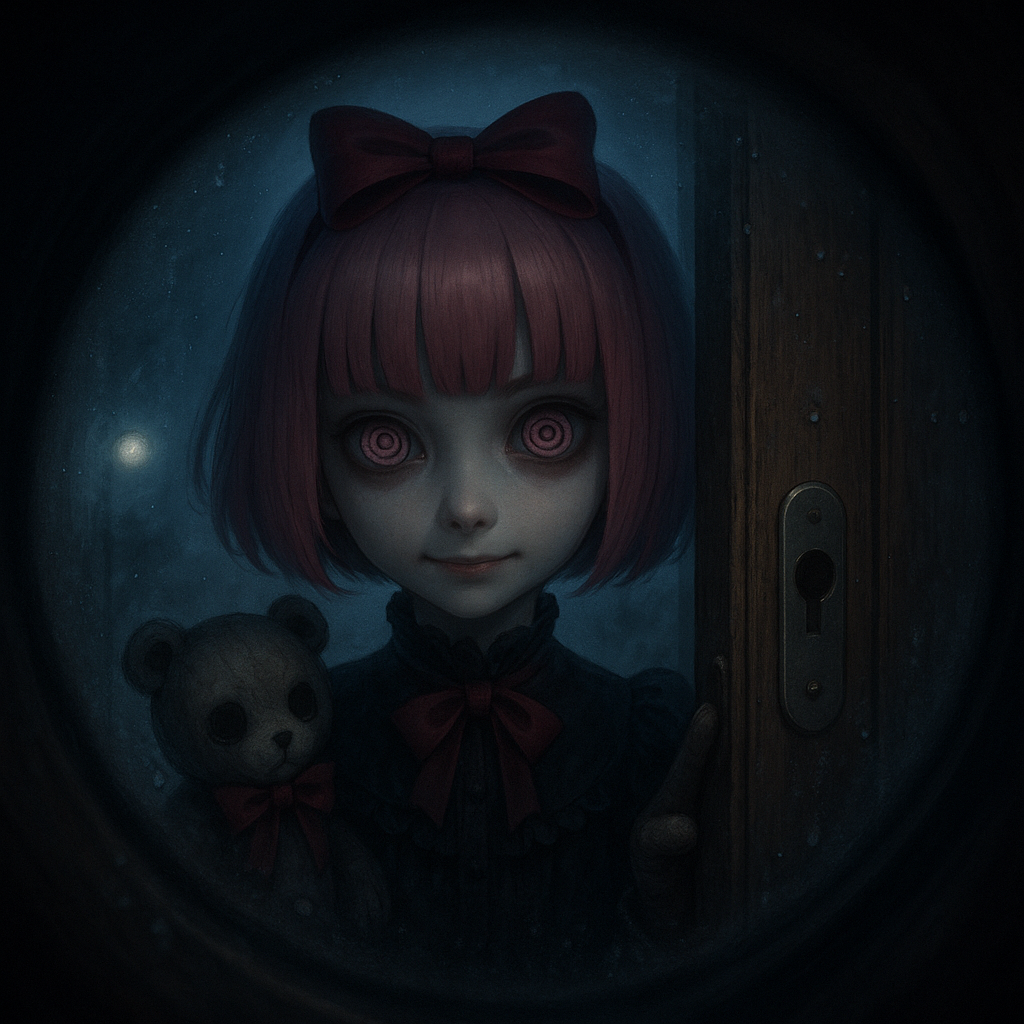 Sections: [Intro] distant door knocks and low drone → [Verse] whisper rhythm with sparse percussive hits → [Refrain] command phrase do not open with rising sub → [Break] heartbeat pulse and wood creaks in darkness → [Drop] metallic impacts and distorted risers → [Outro] knocks recede into cold air → [End]
