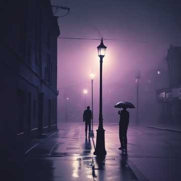 A melancholic digital painting of a lonely man sitting in the rain at night, reflecting on heartbreak and betrayal, soft glowing street lights in the background, subtle fog, dark blue and purple tones, cinematic and emotional mood, highly detailed, perfect for a sad melodic dubstep cover