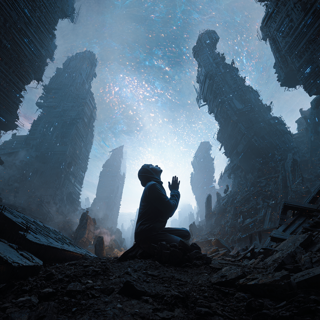 BPM140, digital hardcore × post-punk rock, Opens with clear piano and holographic ambient textures, gradually invaded by metallic noise and distorted guitars, Overdriven, growling distorted bass, heavy tight kick drums, and bouncing snare hits, Vocal is raspy and dirty, singing like a restrained prayer — calm yet burning inside, In the chorus, distorted guitars and deep-reverb snares collide, transforming the prayer into explosive noise, After the climax, only lingering echoes remain, fading into silence, A composition embodying BACK LINE’s contrast between “stillness” and “violence, ”
