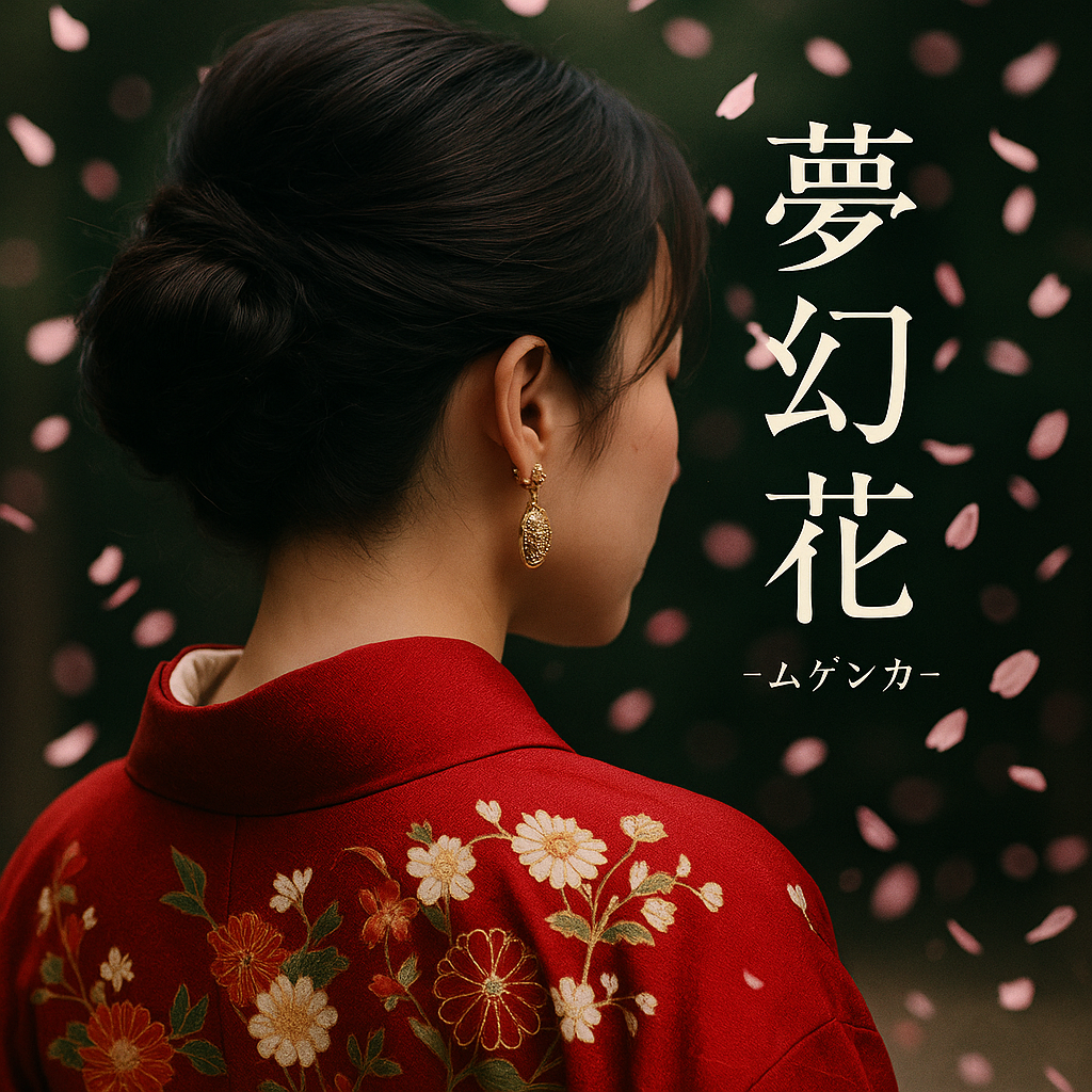 Cyber Enka with a rich blend of traditional Japanese instruments and futuristic digital textures, Prominent shamisen riffs layered throughout, adding a sharp and emotional edge, Soft shakuhachi melodies and synthetic koto harmonies evoke nostalgic sorrow, Vocals are emotional and expressive, with subtle autotune and vibrato, Mid-tempo rhythm with 808 bass and ambient glitch effects, A beautiful fusion of ancient and digital — echoing like a synthetic prayer through the neon mist, Inspired by fleeting love, fading memories, and a flower that blooms in the virtual void, Title: "Yumegenka -ムゲンカ-"