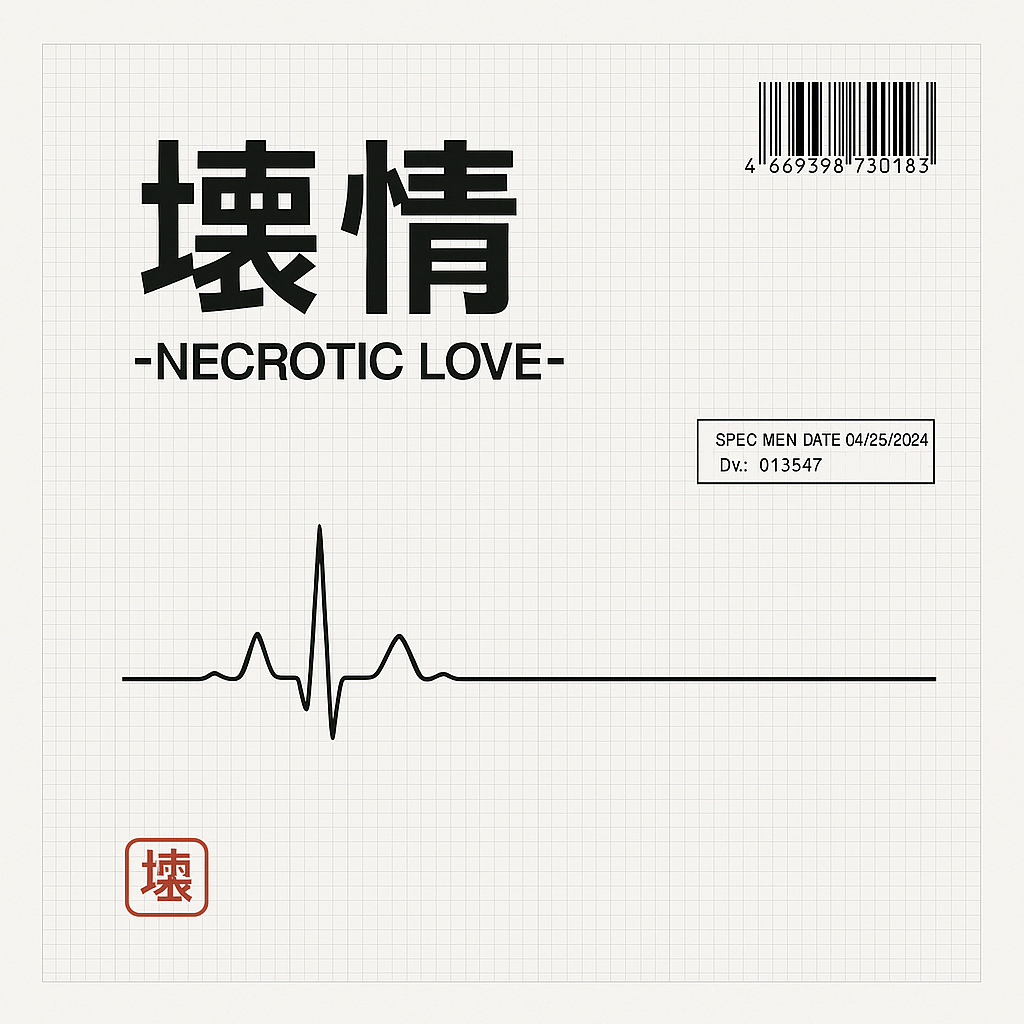 Digital hardcore punk, zero-emo, raw and nasty, 190 BPM, D minor, 2:30–2:50, D-beat/2-step drums: heavy tight kick, cracking snare, Downstroke power-chords, razor L/R guitars; no pads, no lush reverb, Short angular riffs, tritone/dissonant stabs, Overdriven growling bass locked to kick, Vocal: shouted/raspy Japanese, barked phrases, minimal pitch; call-and-response gang shouts, Keep chorus chantable by rhythm, not melody: “壊情! 壊情! Hey! Hey! / Necrotic Love!”