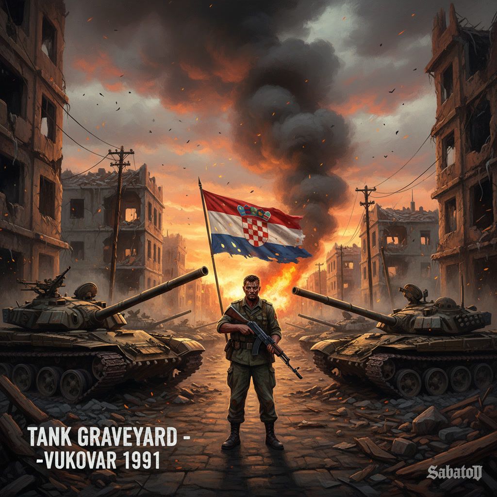 Style: A powerful mix of military metal and patriotic rock, Vocal tone: Deep, heroic male voice with emotion and pride, Instruments: Heavy distorted guitars, marching snare drums, strong bass, orchestral brass, and choirs in the chorus, Mood: Triumphant, emotional, proud, and tragic at once, Tempo: Mid-tempo march (around 90–100 BPM), Language: English, Theme: The Croatian defenders of Vukovar holding their ground on Trpinjska road — the “Tank Graveyard”, Realistic war imagery, unity, courage, and sacrifice