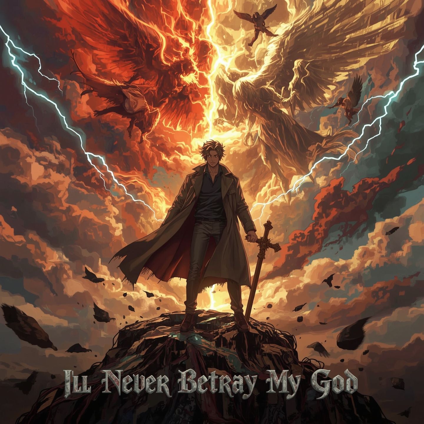 A dark, spiritual metal anthem merging sacred gospel harmonies with heavy, emotional riffs, The song opens with haunting church organ and low male chanting, before distorted guitars crash in like thunder, Deep, soulful vocals declare unwavering faith — raw, gritty, and full of conviction, The rhythm drives with steady double kicks, echoed by choral “amen” responses that rise behind him like angels in rebellion, Mid-song, a breakdown of choirs and drums builds into a majestic solo — echoing both worship and war, The final chorus explodes with layered guitars, orchestral brass, and roaring vocals shouting “I’ll never betray my God!” before fading into a cathedral-like silence, Mood: powerful, sacred, defiant, redemptive