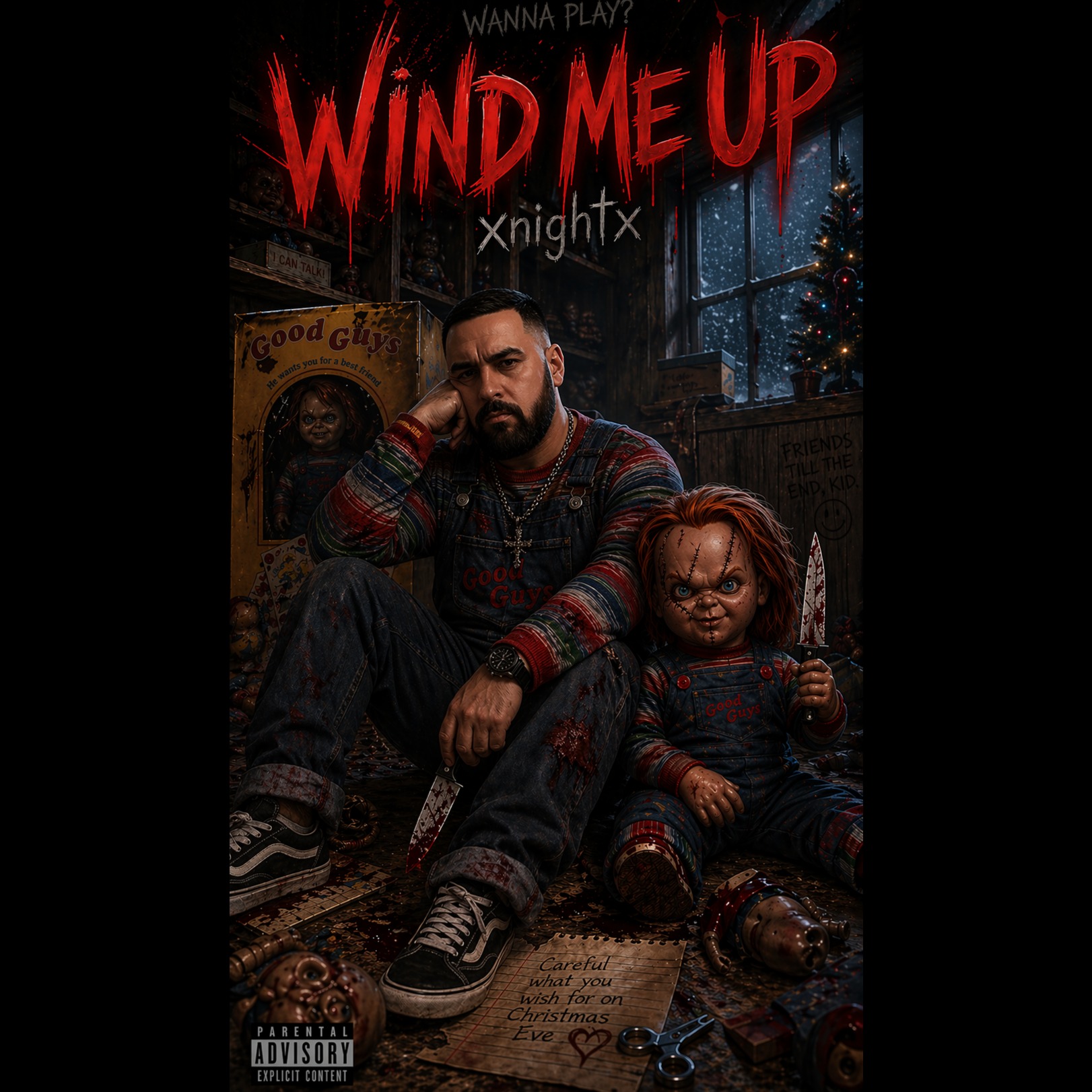theatrical horror metal, dark orchestral, cinematic choir swells, heavy distorted guitars, dramatic tempo shifts, twin guitar harmonies, pipe organ undertones, haunted music box melody woven through verses, evil raspy lead vocals with clean baritone contrast, spoken word villain monologue, sardonic dark humor delivery, whispered verses exploding into anthemic choruses, children's lullaby corrupted into metal riff, string section tension builds, sudden dynamic drops before chorus, double bass drum gallop, reverb-soaked guitar solo with whammy dives, operatic backing choir, eerie toy jingle in intro and outro, music box piano fading to silence, menacing tone shifts to darkly comedic, horror soundtrack energy meets power metal grandeur, villain origin story arc, unsettling intimate vocal delivery, slow creeping dread erupting into chaos, gothic theatricality, arena metal bombast, campy evil hiding genuine menace, cold reverb on spoken sections, sinister toy store ambiance