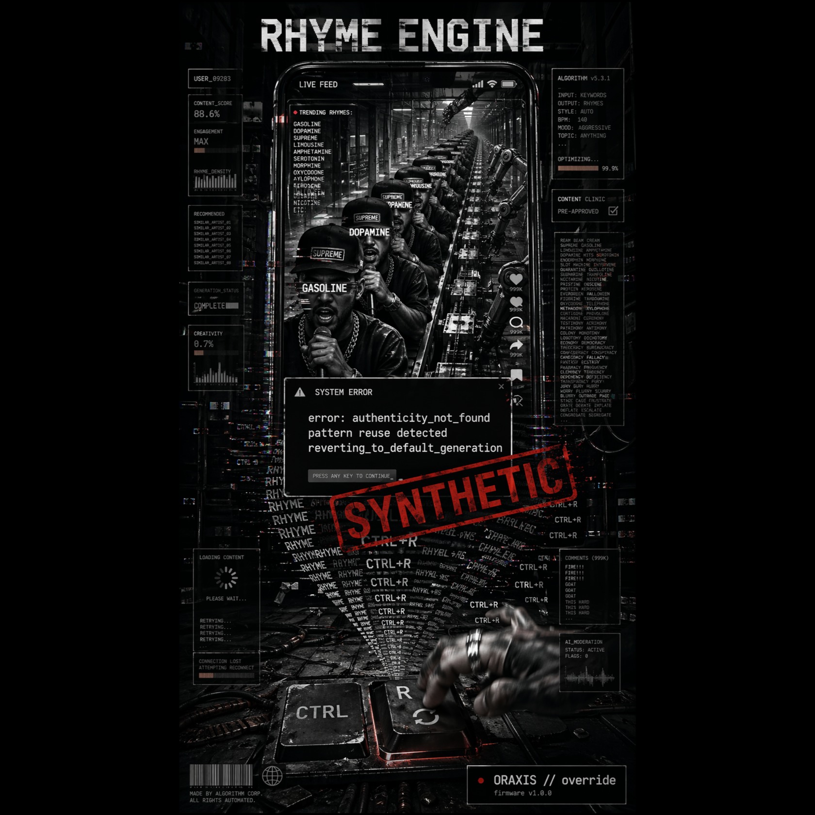 industrial hip-hop, glitch rap, 130 BPM, clipped percussion, distorted sub-bass, mechanical drum programming, digital artifacts, buffer repeats, sample-rate reduction, sample-locked stabs, close-mic guitar harmonics, tape-stop edits, cold overdrive, radio-static mono mix, decayed outro, abrupt noise burst, dial tone ending