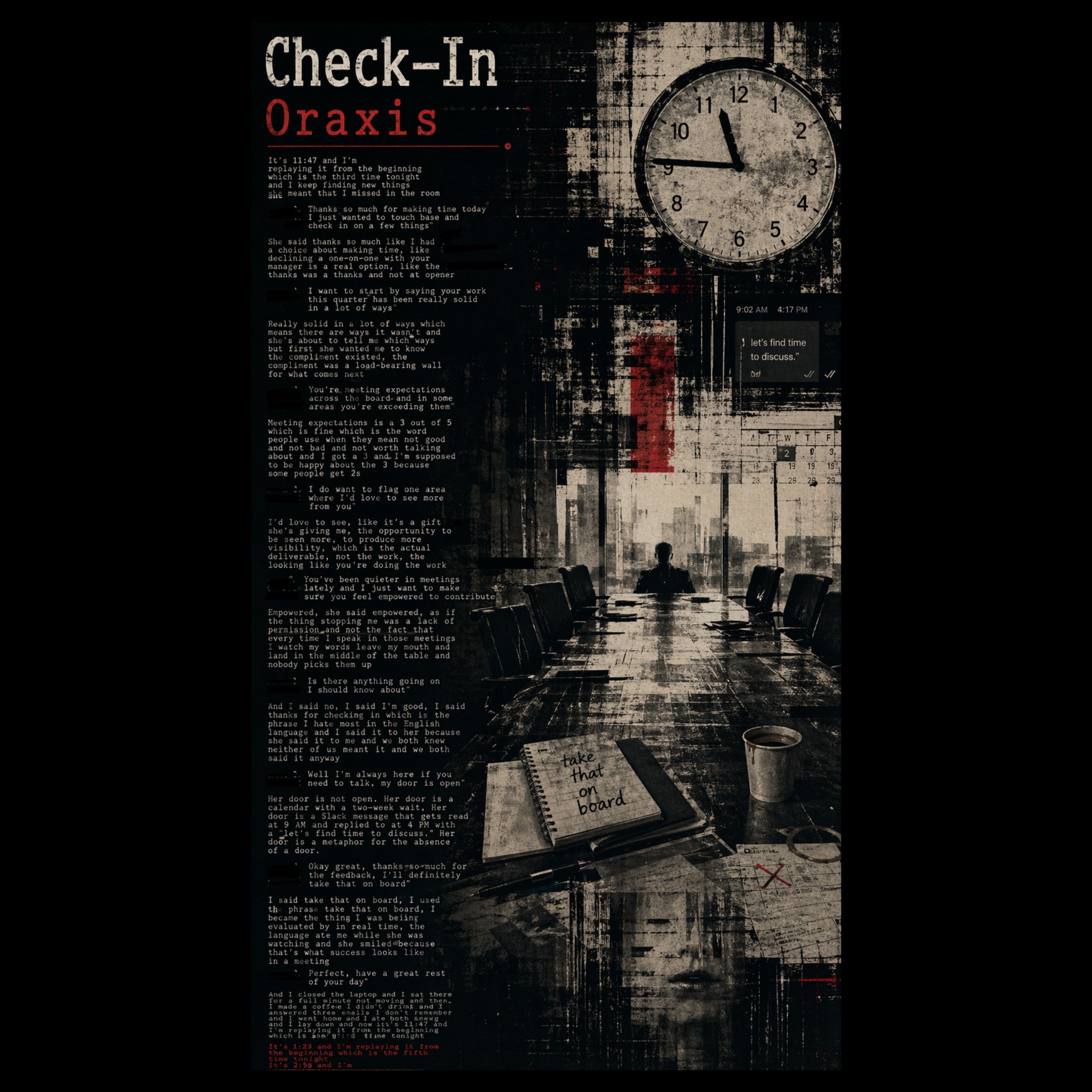 Art rock/post-punk with close-miked, bone-dry female lead vocal shifting from clipped managerial delivery to spiraling spoken-sung phrasing, Analog synth drone, sparse felt piano, bass entering midway, drum machine arriving late, 74 to 88 BPM, industrial warmth, claustrophobic tension, centered mix, symmetrical placement, no hard-pan, mantric final repetition