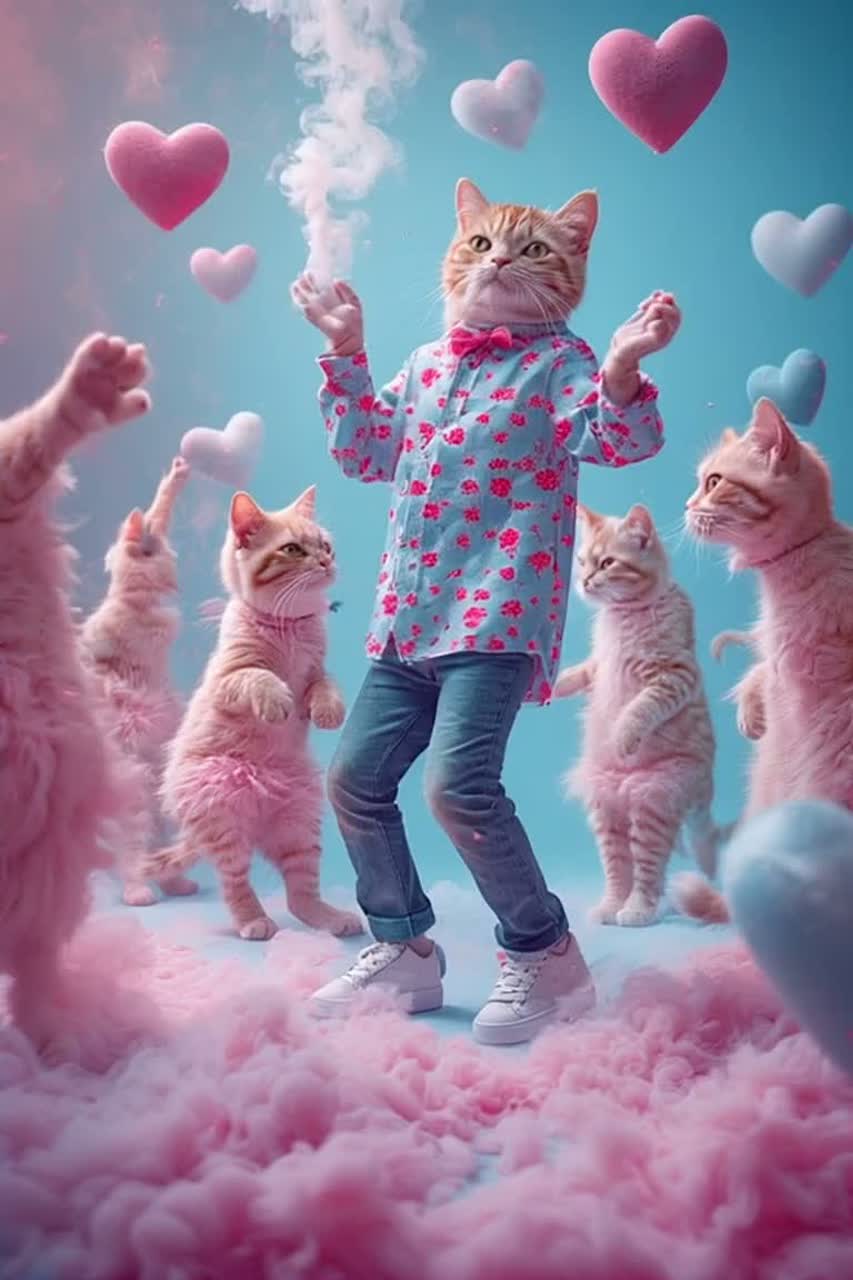 Retro synthwave meets bubbly synthpop, uptempo groove around 115 BPM, bright arps and lush pads, sidechained bass pulsing under a playful lead, Vocal hook built entirely from processed cat meows, chopped and pitched into a catchy topline; occasional stacked “choir of cats” harmonies, Energy lifts in the chorus with glittery counter-melodies and widened stereo field, then dips to a filtered, half-time bridge before a final, explosive hook, synthpop, no human singing only cats meow and hiss