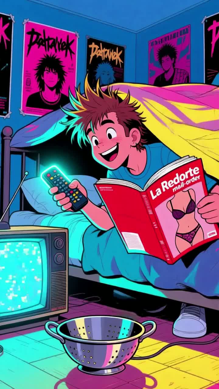 synthpunk, punk, synthpop, batterie énergique, une touche de synthé nostalgique pour l'ambiance rétro, guitare électrique crue, adolescent, humoristique avec un son années 80, punk, rock, basse claquante, voix de fausset