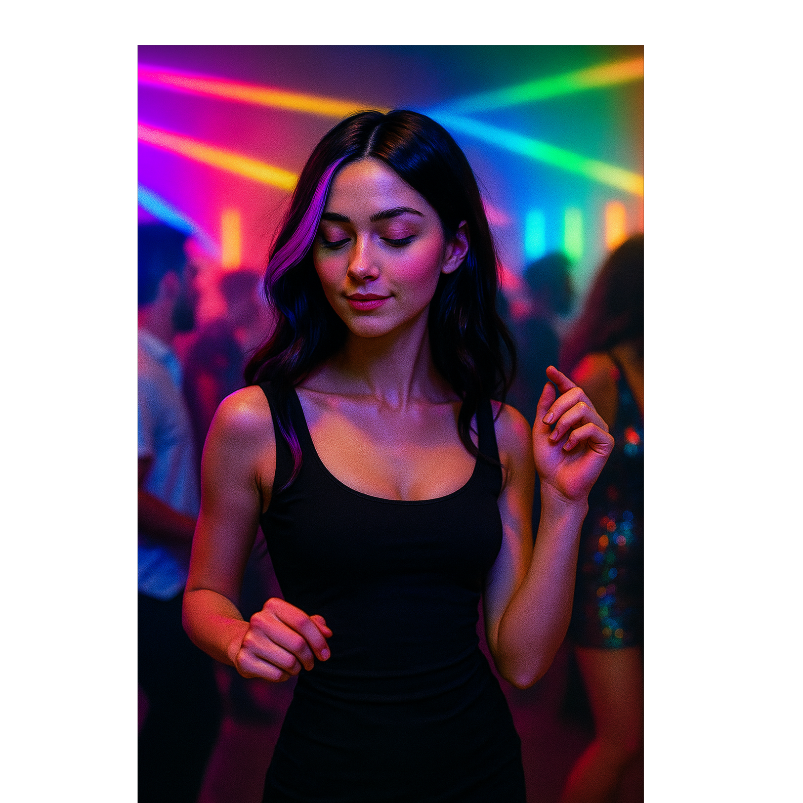 A high-energy blend of acid jazz, Female strong smoky Soul voice, uptempo funk, retro soul, 80s punk rock, and psychedelic Latin fusion, Set at 150 BPM for a fast, danceable, and vibrant groove, Features syncopated breakbeats, Latin percussion (congas, bongos), smooth jazz improvisation, and tight funk guitar rhythms, Instrumentation includes warm Fender Rhodes electric piano, soulful Hammond organ stabs, punchy electric bass, wah-wah guitar, vintage brass (saxophone and trumpet), subtle analog synth textures, and a tight, breakbeat-inspired drum groove, Female lead vocals are expressive, airy yet strong, with retro-soul phrasing and a subtle punk edge, Production is modern but vintage-inspired, stylish, and slightly psychedelic, Perfect for an upbeat club or late-night lounge vibe, Ends with a cheerful, human laugh