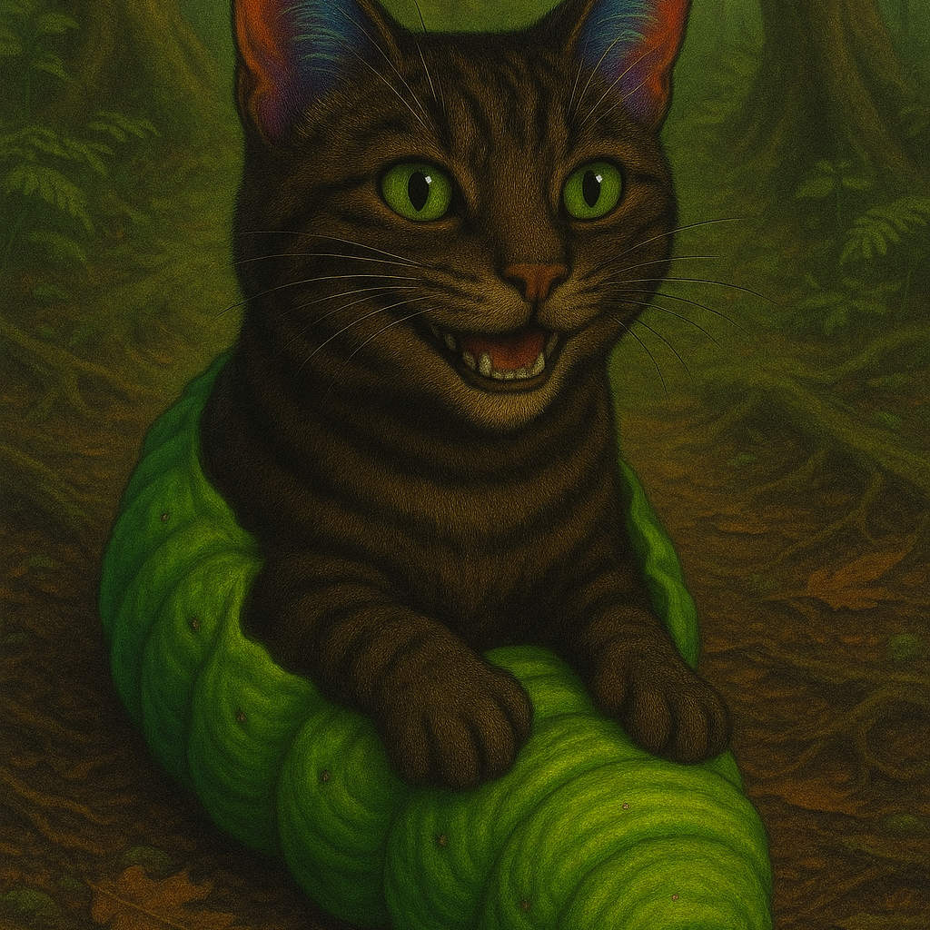 German voice song, Rap, HipHop, Post Punk, 8-bit, fast Jungle, Female fast strong smoky Soul voice, A surreal, absurd spoken-word pop song with a fast jungle beat, glitchy 8-bit layers, and raw punk rock energy, Female strong smoky voice, slightly ironic and confidently confused, The lyrics explore identity, transformation, and self-irony with humor and existential flair, Imagine a woman who believes she’s a living art piece made of past lives: caterpillar, cat, and now a chaotic human, Sound FX include soft cat purring, abrupt meowing, glassy mirror cracking, houseplant rustling, elevator music fragments, cheesy synth sparkle, awkward silence moments, absurd meme sounds (button presses, random applause, “bäm!”), and faint laughter in the background, Mood is playful, slightly deranged, introspective but never serious, Delivery is theatrical, twitchy, and unpredictable, Occasional spoken breaks like internal monologue, Style jumps between glitchy electronica, spoken-word punk, and