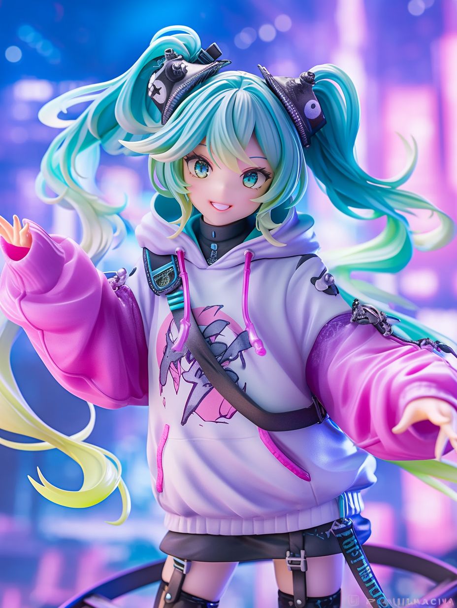 High-energy Eurobeat anime-style scene, neon dance floor glowing with vivid pink and blue lights, crowd jumping and clapping, confetti flying in the air, A cheerful, cute young girl in a colorful idol outfit with sparkling accessories leads the dance, full of energy, smiling brightly, Motion blur effects to show fast movement, vibrant colors, high contrast, 90s Eurobeat rave vibe, Text “Burn the Night!” glowing in neon above the stage