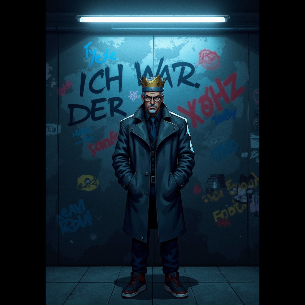 80s-style Neue Deutsche Welle with dark analog synths, dry marching drums, pulsing bass, and minimal cold wave atmosphere, German male vocals in expressive spoken word with slight melodic hooks, Inspired by Falco and Joachim Witt, Melancholic yet self-aware tone, Echo effects, radio-style filter bridge, and an ironic outro whisper