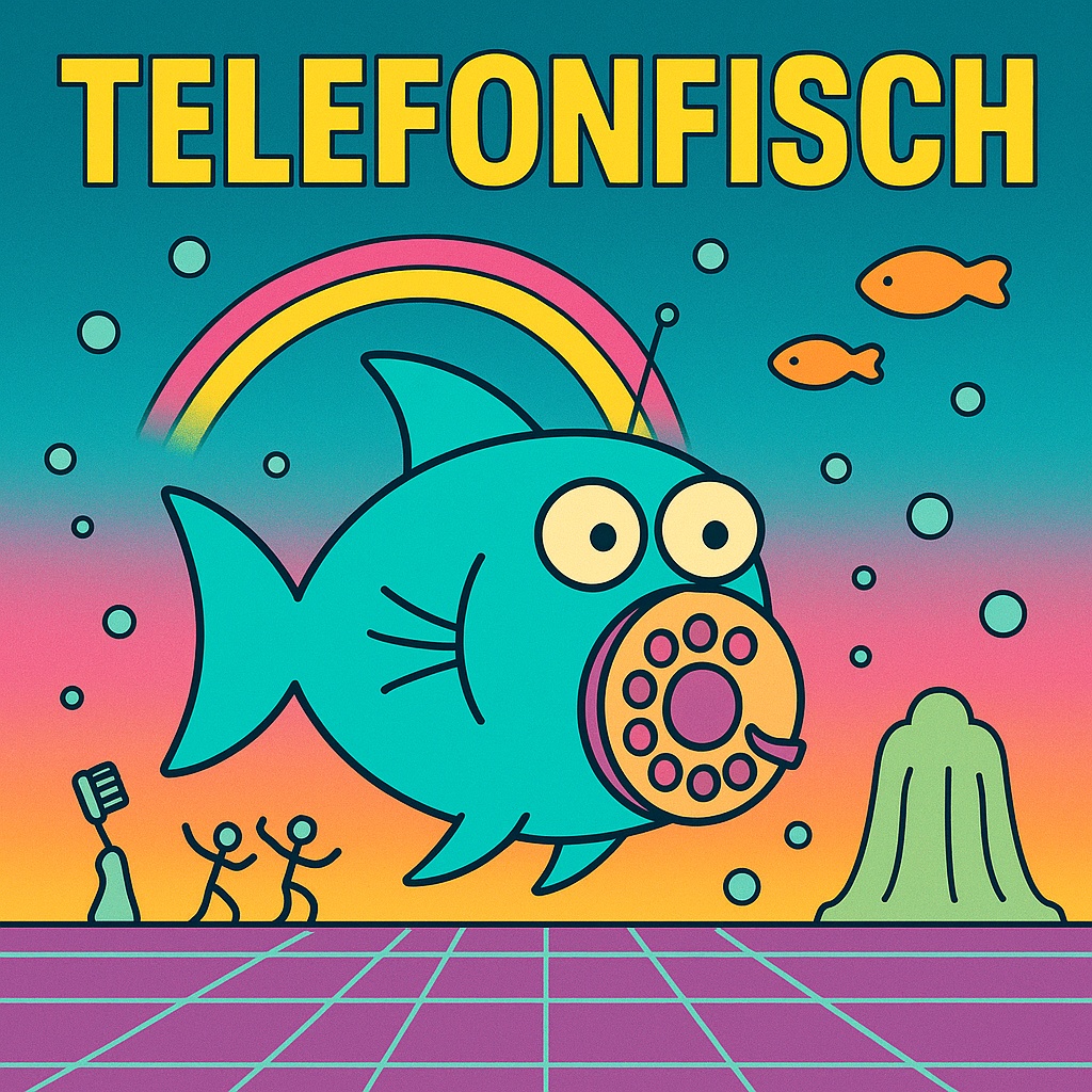 electronic 80s instrumentation with classic drum machines (like LinnDrum or TR-808), minimal synth basslines, tight and punchy, bright arpeggiated synth leads with simple melodic hooks, sparse electric guitar riffs with clean chorus effect, robotic, slightly detached vocal delivery with German accent, playful, surreal mood with slight irony, include quirky sound effects (bubble pops, phone dialing, whooshes), steady 4/4 danceable beat, around 110-120 BPM, subtle vocoder or layered backing vocals in chorus sections, occasional minimal synth breakdowns before chorus, mix should be clear, dry and punchy, with wide stereo on synth layers, outro can fade out with repeating “Telefonfisch” hook and fading synths