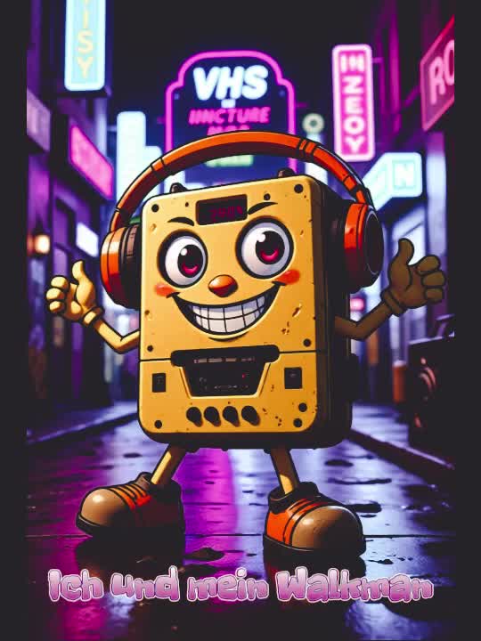 Create a song in the style of "Neue Deutsche Welle" (German New Wave) from the 1980s, female vocals focusing on the personal and slightly absurd relationship with a Walkman, Minimalistic synth-pop like German lyrics, catchy and slightly ironic, Roland TR-808 drum machine, analog synthesizers, cassette tape sounds, arpeggiators, vintage reverb, Mid-tempo, danceable (around 120-130 BPM), Playful, nostalgic, quirky, with 1980s German atmosphere, Intro with cassette click sounds, verses with minimal synths, catchy chorus with fat snare and "Walkman" backing vocals, instrumental break with cassette rewind style solo, bridge with spoken-word style, outro with cassette stop sound and slowing tempo (like dying batteries), 1980s nostalgia, personal relationship with technology (yellow Walkman), portable music culture, youth freedom, characteristic German vocals, synthesizer work, and Walkman-related sound effects