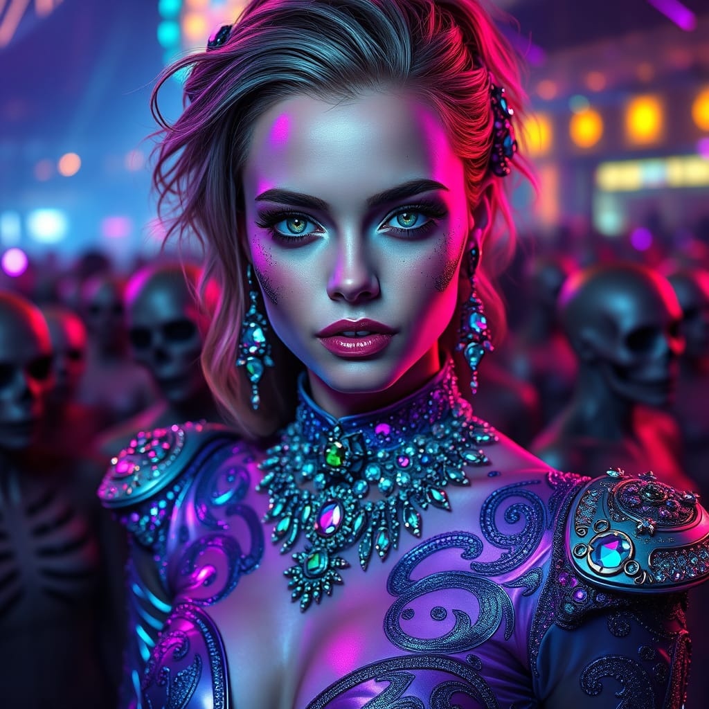 Rave, Trance, EDM, Dark Carnival Synthwave, 120 BPM, Key of Dm, eerie calliope, pounding bass, industrial beats, cyber-horror synths, haunting chants, female vocals, ominous atmosphere