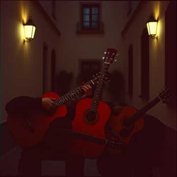 Create an energetic flamenco-fusion acoustic guitar piece in Em, using Phrygian and Dorian colors, Core progression: Em–D–C with B7 tension and brief shifts to Fmaj and G, Tempo ~190 BPM, Three guitars in call-and-response, with rapid picado lines, rasgueado bursts, syncopated accents, solos and percussive body taps, bright staccato runs, and evolving melodic variations, Keep awarm, intimate live sound with wide stereo imaging, Add dynamic crescendos, playful rhythmic exchanges, and virtuoso solo passages, No drums, only acoustic performance, 6 minutes long, [acoustic_guitar] [flamenco_rumba] [fast_picking] [high_energy] [latin_fusion] [percussive_strings] [tight_mix] [bright_attack] [stereo_width_wide]