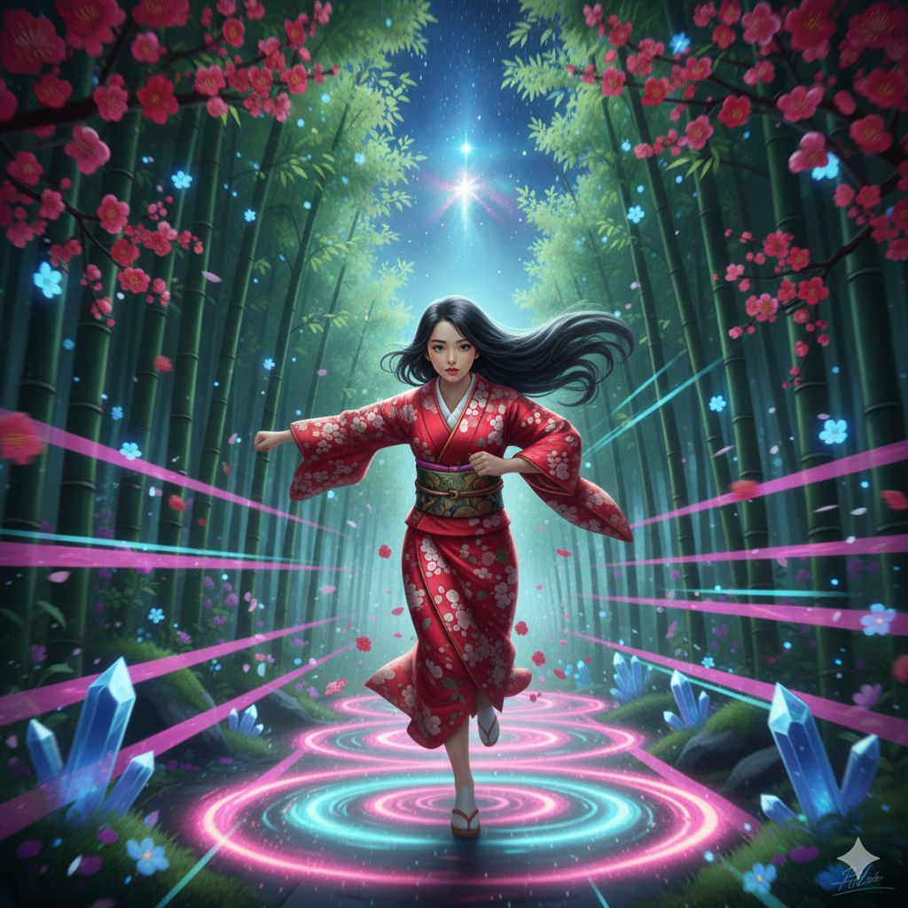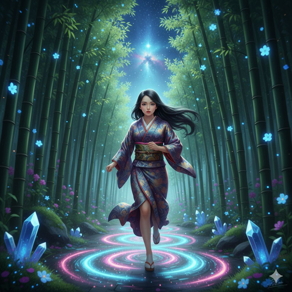Celestial, fairy-tale-like, slightly mystical, Feels spiritual but joyful rather than solemn, Imagine a small magical being running freely through a luminous universe