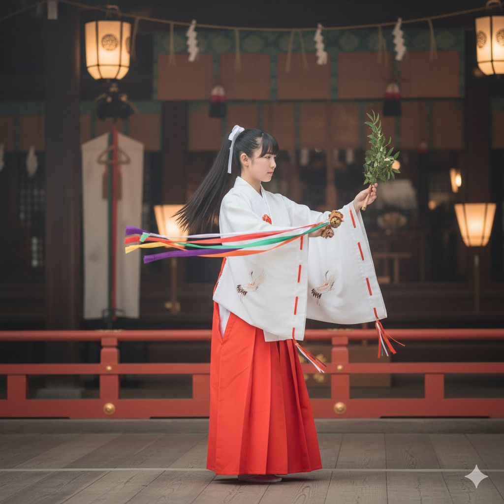 A sacred Japanese Kagura-style ceremonial music, Only traditional Shinto instruments: kagura bells, koto, hichiriki, flute, taiko, No modern instruments, no synthesizers, Slow, solemn, spacious atmosphere, Sounds echo as if performed inside a shrine, Female vocal is soft, pure, and prayer-like, similar to norito chanting, Long instrumental sections with only Kagura sounds, Theme: purification, gratitude, welcoming gods, end of year and beginning of a new year, Very spiritual, divine, and peaceful