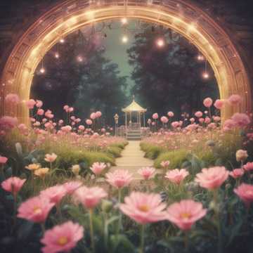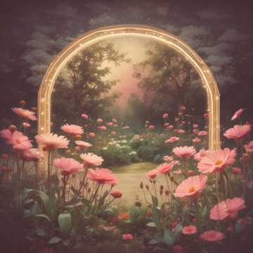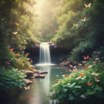 A serene celestial garden with gentle harp melodies, soft water sounds like a flowing waterfall, the rustling of green leaves, butterflies dancing in sunlight, and a delicate music box tone, Ethereal, peaceful, and dreamlike atmosphere, slow tempo, cinematic ambient style, “with a touch of heavenly light and soft choral voices in the distance”