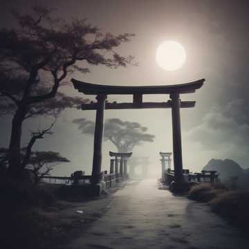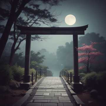 A sacred Japanese instrumental evoking ancient gods, A miko princess walks through a misty shrine path toward the torii gate, Slow start with koto, shakuhachi, sho, and bells — calm and spiritual, Taiko and shinobue gradually build intensity like a kagura ritual, reaching a divine, powerful climax, then fading into quiet wind and suzu, No vocals