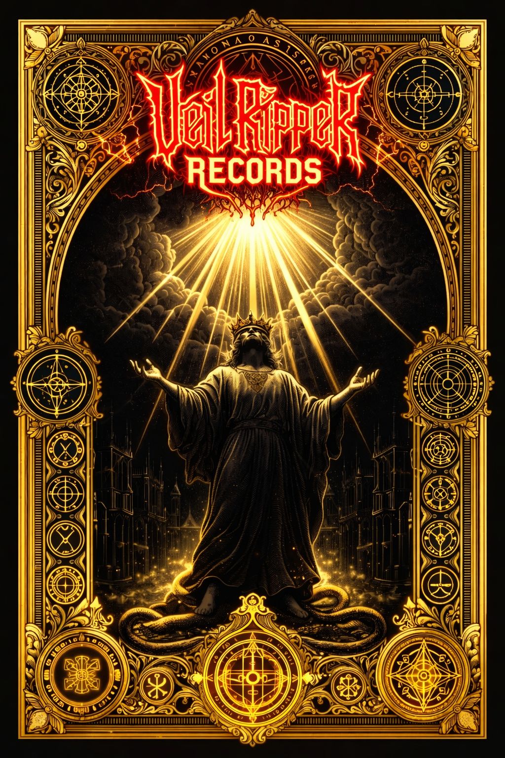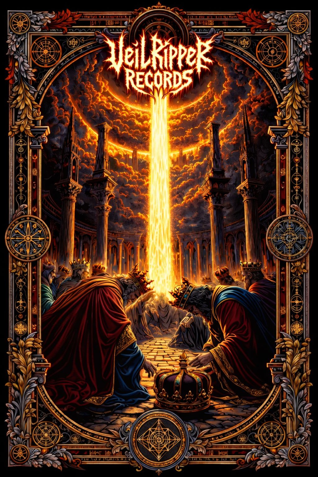 An epic, battle-driven fusion of power metal and punchy deathcore/groove metal, Heroic melodic riffs and soaring harmonized leads clash with low-tuned chugs and crushing breakdowns, Drums alternate between galloping double-kicks and heavy groove stomp patterns, Vocals: deep growls, screamed war-chants, no clean singing, Verses feel martial and urgent; choruses expand into triumphant, massive climaxes with epic tremolo melodies over brutal rhythm guitars, Add a colossal half-time breakdown that feels like a siege engine crushing gates, Mood: heroic, dark, intense, Tempo: 110–150 BPM, Key: Minor / harmonic minor for epic tension, No Synth