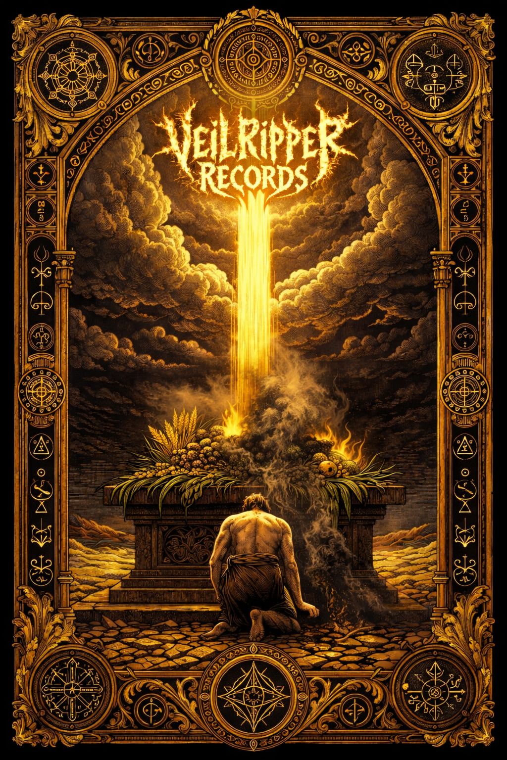 Tragic heroic deathcore, 90–110 BPM, Drop A, Massive low-tuned chugs and slow crushing grooves with dark cinematic atmosphere, Dramatic minor-key melodies and epic tension, Thunderous drums, deep sub bass, colossal breakdowns, Vocals deep growls and fierce screams, supported by **powerful tenor choir chants** adding biblical gravity and sacred weight, Mood solemn, heroic and apocalyptic, Production wide, monumental, cathedral-like, overwhelming and reverent