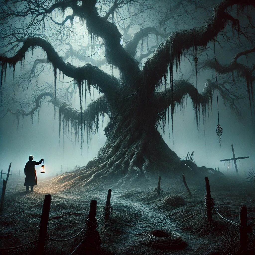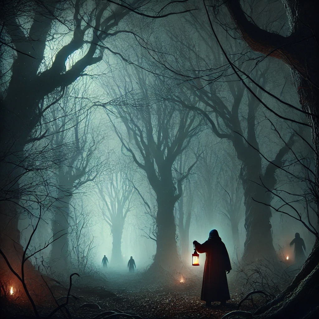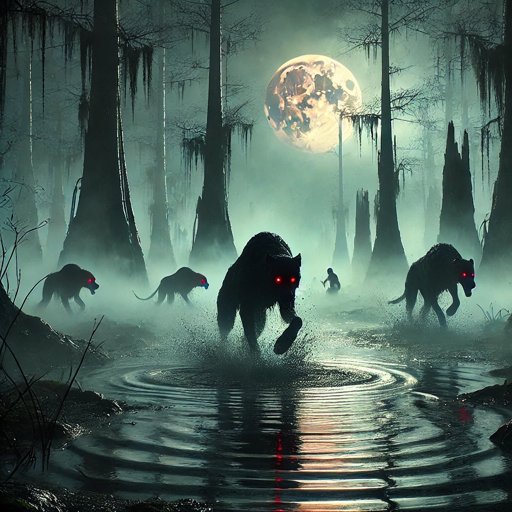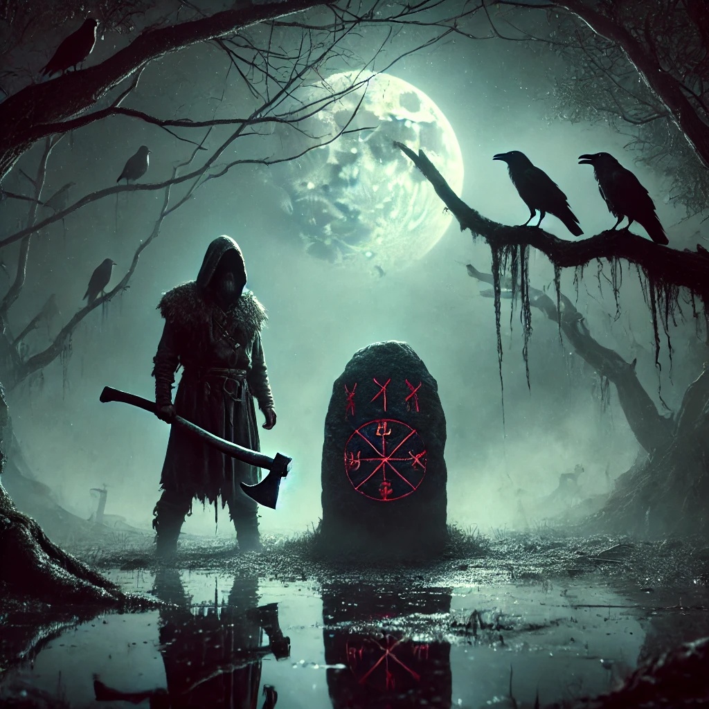 Swampy blues slide guitar, deep war drums, eerie throat singing, Ethereal female vocals, Dark and cinematic—Southern Gothic meets Norse nightmare, A lone traveler hunted by unseen forces in the night