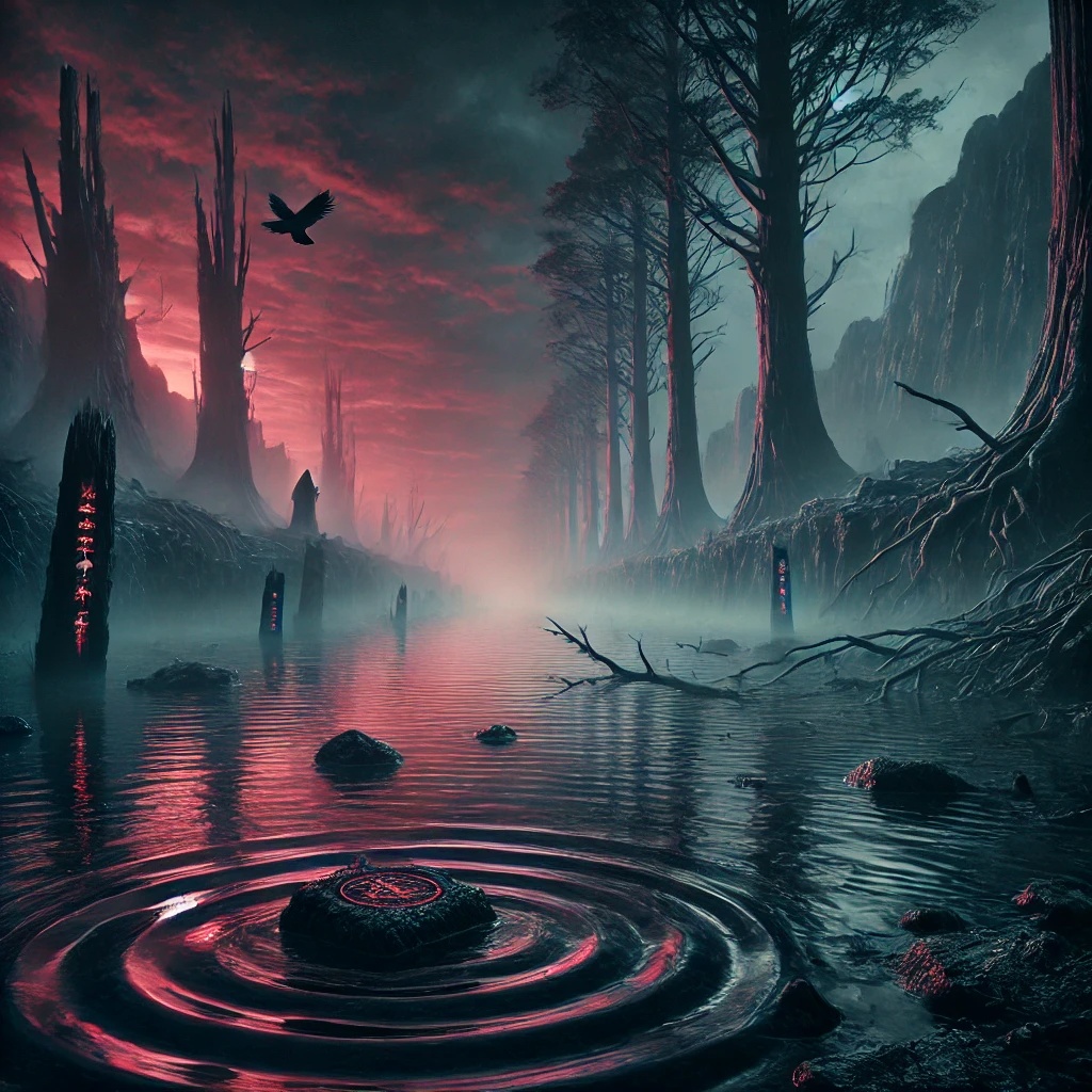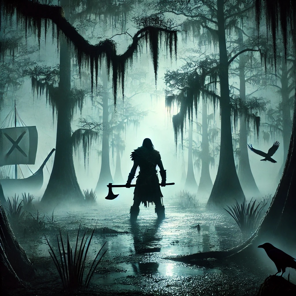 Swampy blues slide guitar, deep war drums, eerie throat singing, Ethereal female vocals, Dark, cinematic atmosphere—Southern Gothic meets Norse death rites, cursed whispers