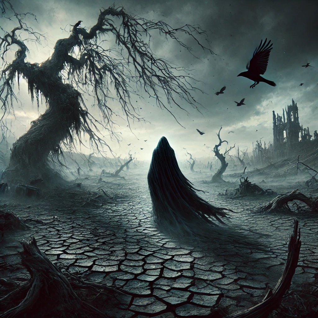 Swampy blues slide guitar, deep war drums, eerie throat singing, Ethereal female vocals, Dark, cinematic atmosphere—Southern Gothic meets Norse ghost lore, The land dies in the wake, slow fade-out