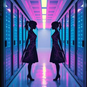Dark electronic music with heavy drops and strong breaks, Mid-to-fast tempo, Deep aggressive wobble bass, distorted sub bass, and punchy electronic drums, Cold, mechanical, cybernetic atmosphere, Two female vocals singing together in a controlled, emotionless harmony, Clean but slightly robotic vocal processing, tight timing, minimal vibrato, Voices often layered in unison and simple harmonies, not expressive or cute, During the break, the two voices separate into soft whisper-like layers, with shimmering synths and glittering arpeggios creating a brief luminous moment, After the break, vocals snap back into a cold unified chant over a brutal bass drop, Minimal lyrics, repetitive and rhythmic, futuristic and restrained