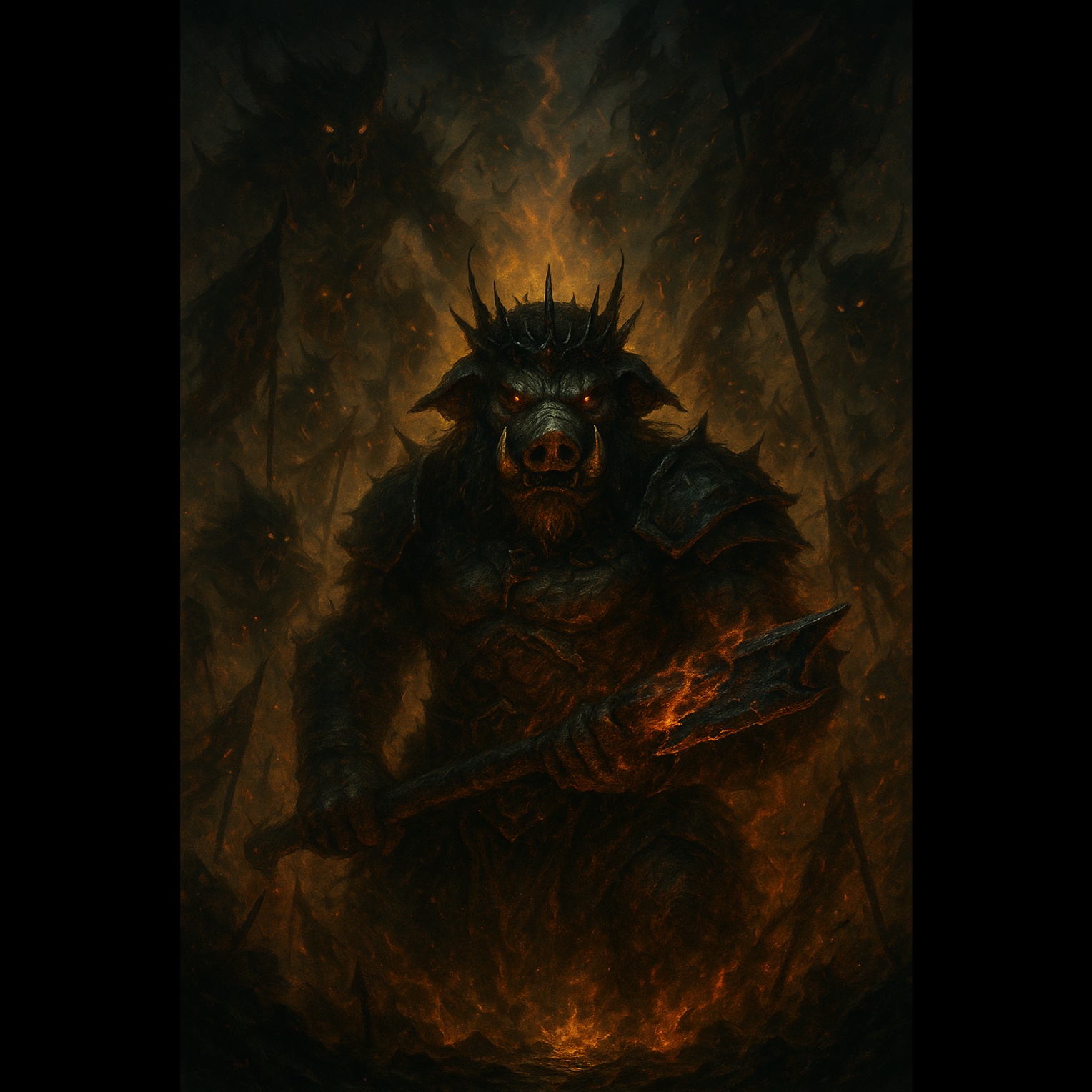 Filthy, ignorant deathcore with ultra-downtuned guitars and aggressive pig squeal vocals, Heavy gutturals in the verses, with thick slamming riffs, grinding blast beats, and occasional fake-out breakdowns, Features extreme pig squeal breakdowns in the style of slam/brutal deathcore, with an intense, chaotic energy, No clean vocals, no melody – just pure violence, Final breakdown is overloaded with pig squeals and downtempo slams, Make it sound like a pig demon summoning ritual in a hellish mine