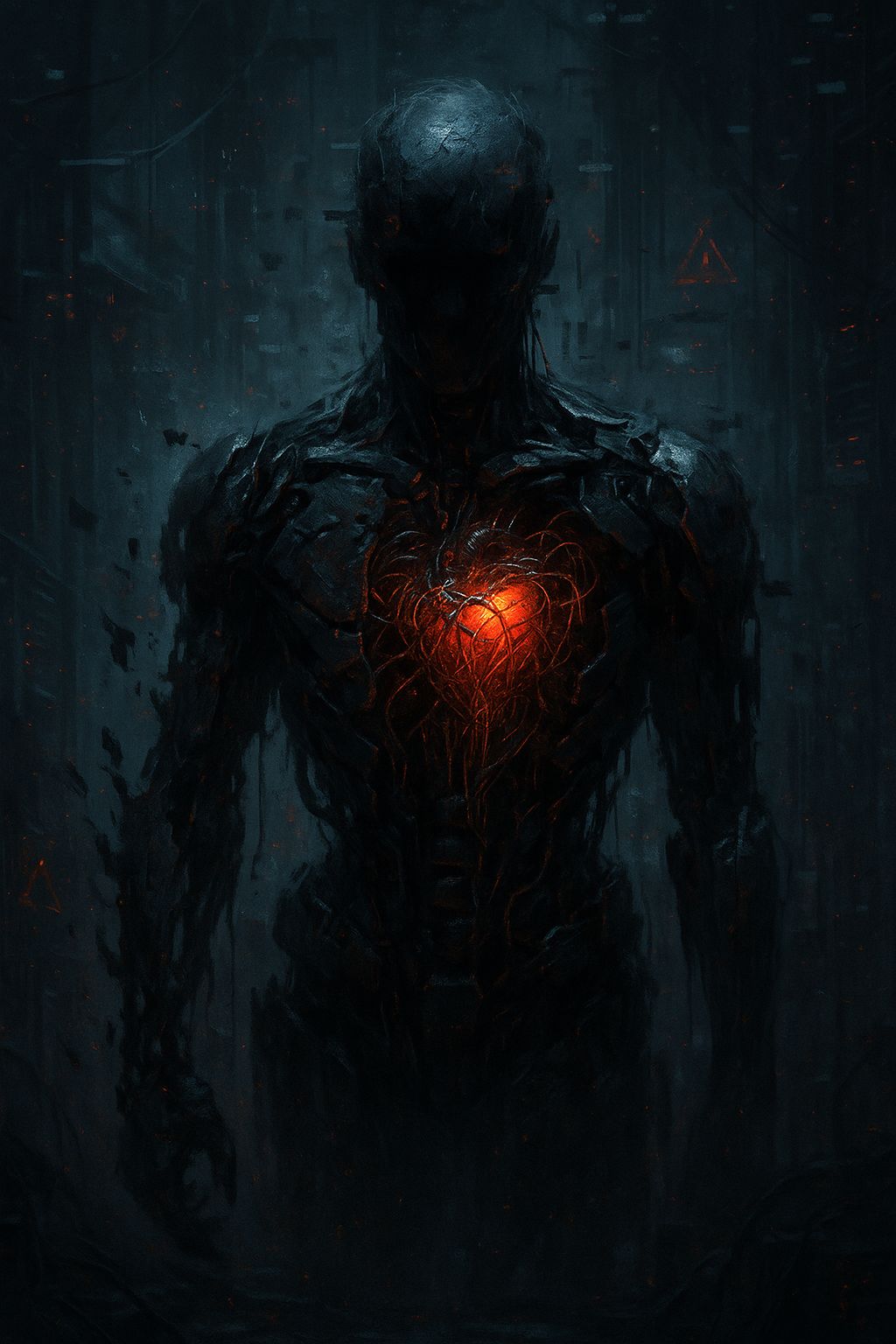 A slow, dark glitch-metal track with heavy industrial atmosphere, Starts with cold spoken male vocals and ambient glitch textures, Builds gradually with screamed verses and clean, haunting choruses, Includes glitch effects like static bursts and loop errors, Ends in a heavy, crushing breakdown with distorted guitars and low growls, Mood: dystopian, hypnotic, controlled, Vocals: male only