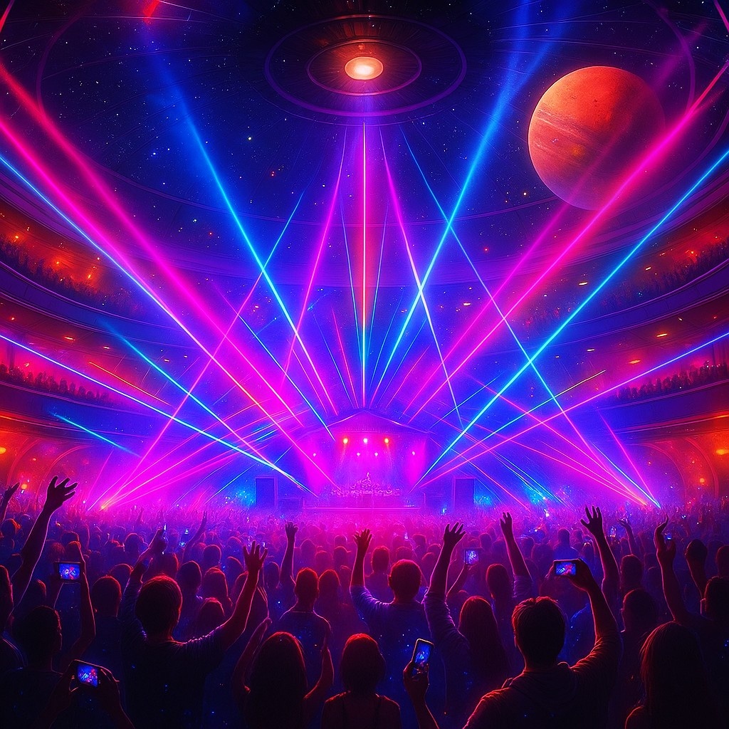 Live concert without audience and crowd noise, A high-energy Eurodance and vast EDM track performed entirely in a fictional Martian language, Designed as a finale explosion after a space concert on Mars, No real-world language is used—only intense, rhythmic Martian-style vocals with aggressive synths and massive drops, The music feels like launching into interstellar space with wild celebration and unstoppable spirit, Wide stereo field, Concert hall ambiance, Spacious midrange, Clean mix, Balanced compression, Mastered at -16 LUFS, Max peak level =-3db, Rich stereo reverb, Clear highs, Deep controlled bass, Polished final mix, Floating melody, Oscillating stereo field, Panning movement, Swirling ambient layers, Expansive reverb, Dreamy and sacred, Binaural-style mix, stereo drift, 155 BPM, ‑Clipping, ‑Distortion, ‑Vocal enhancement, ‑Vocal distortion, ‑harsh treble, ‑over compression