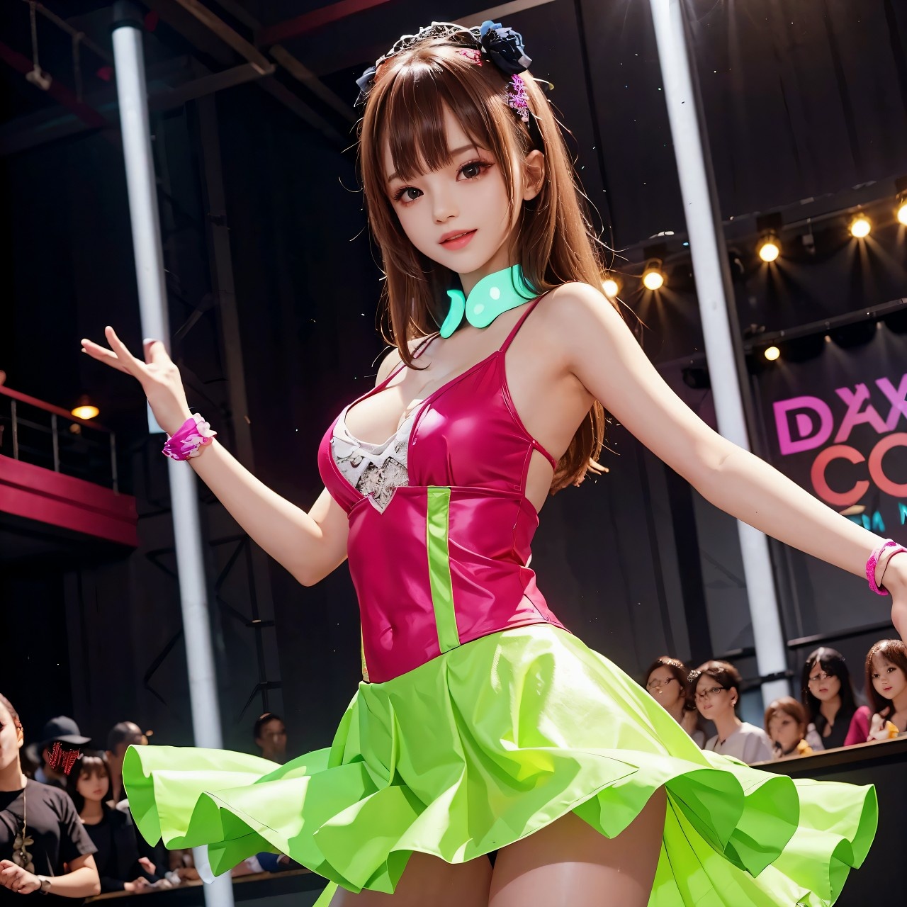Club-style drop with kick emphasis, Live audience intro, Crowd cheering, Club MC voice, Excited shout, Use light percussions, kawaii sound FX, cartoon sparkle, ‑Clipping, ‑Distortion