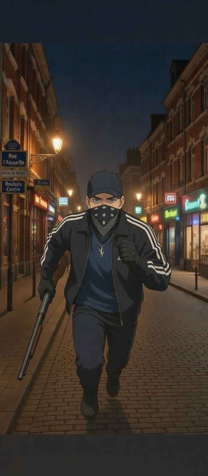 Aggressive Dark French North Street Trap Rap Roubaix, Heavy Blooming 808 Bass Menacing Slides, Fast Crisp Hi-Hats, Dark Atmospheric Pads Reverb Synths, Tempo 100-BPM, Raw Gritty Male French Voice, Ad-libs Cinematic Street Warfare Vibe Emergence, Shadow G-ko, Loyalty, ‑Voix