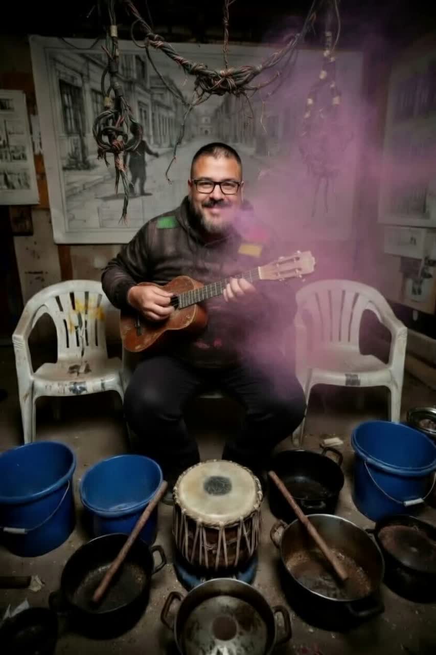 Emotional Stoner Surf Rock Ballad, Slow Murga-Rock Groove, 98 BPM, Raw Junk Percussion (Industrial Buckets, Metal Pots, Indian Tabla), Twangy Electric Ukulele with Heavy Spring Reverb, Deep Fuzzy Slap Bass, Charismatic, raspy Rioplatense Male Vocals, Infectious "Mental Gum" soul hook
