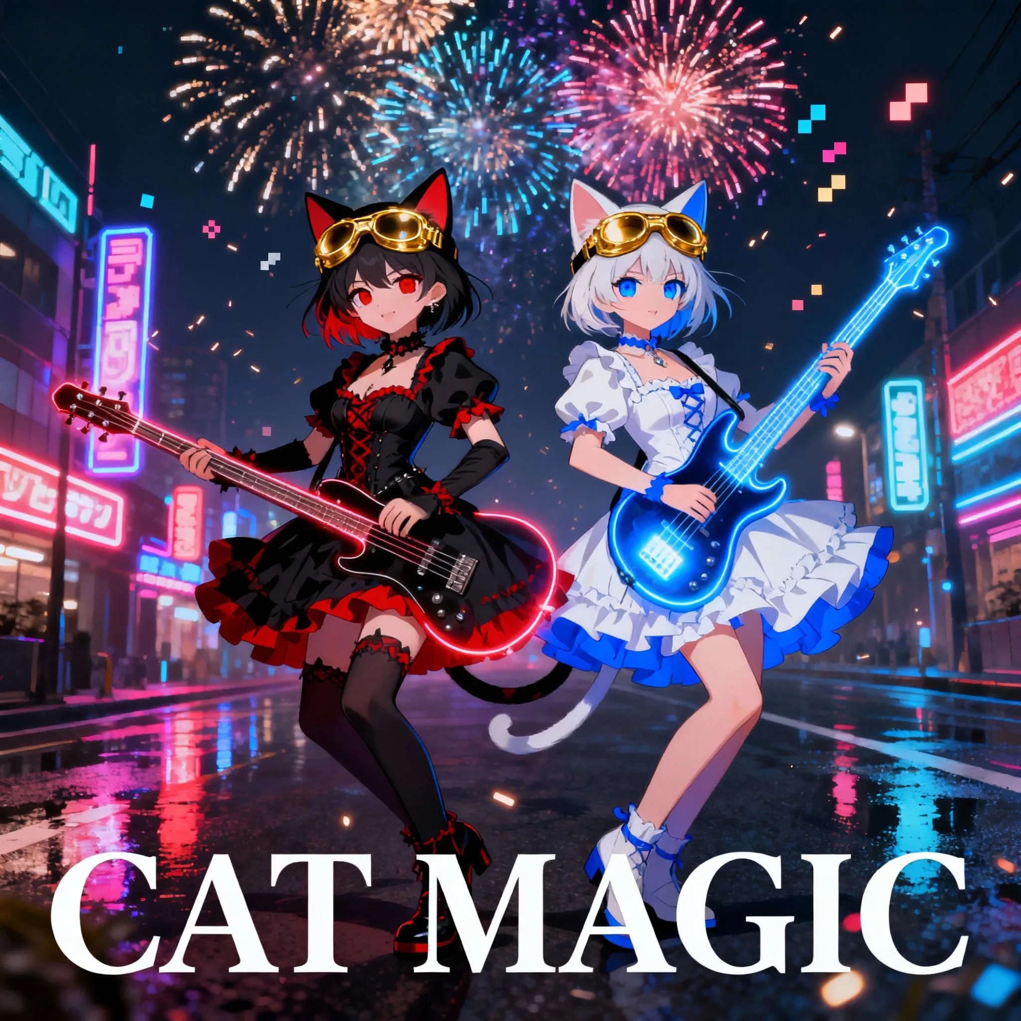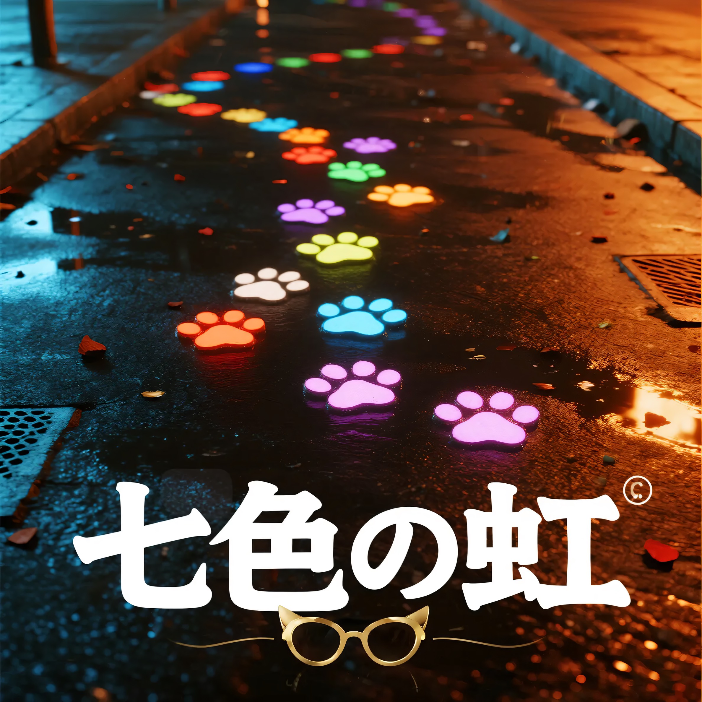Energetic 90s-style Japanese Rock anthem with female lead vocals in a husky yet powerful tone, distorted electric guitars panned hard left and right for wide stereo, solid bass groove in the center, fast straight rock beat with open hi-hats and crashing cymbals, soaring emotional chorus with call-and-response harmonies, sharp focus and no blur, vivid rainbow imagery with cat motifs, emotional and powerful atmosphere | exclude: blur, haze, fog, out-of-focus, soft edges, low resolution, excessive layering, overlapping piano/guitar, harsh transients, phase smear, distorted saturation, sub-bass overload, overcompression, long reverb tails, extra limbs, deformed paws, distorted flowers, text errors, watermark, signature, ‑exclude: blur, ‑haze, ‑fog, ‑out-of-focus, ‑soft edges, ‑low resolution, ‑extra limbs, ‑deformed paws, ‑distorted flowers, ‑text errors, ‑watermark, ‑signature