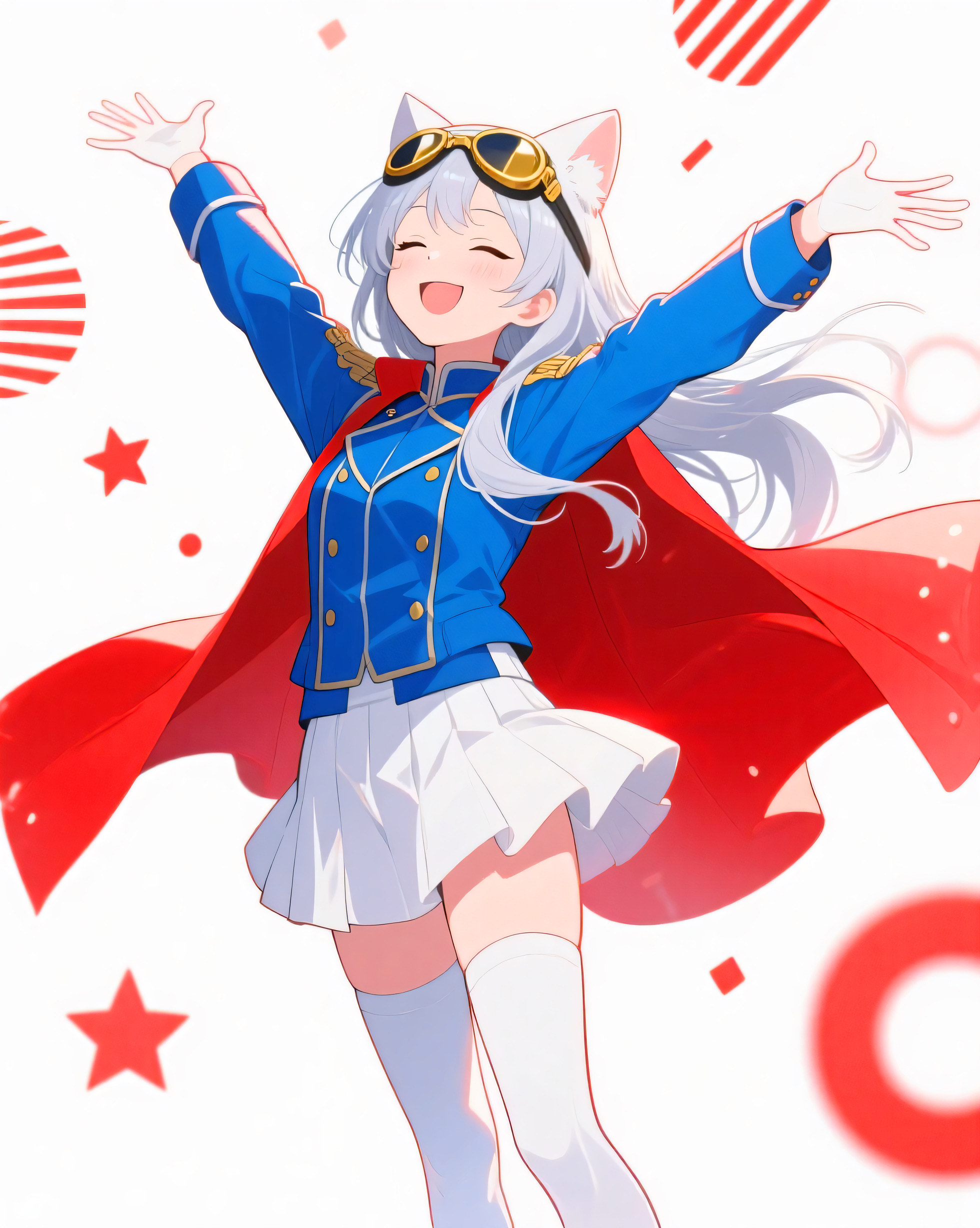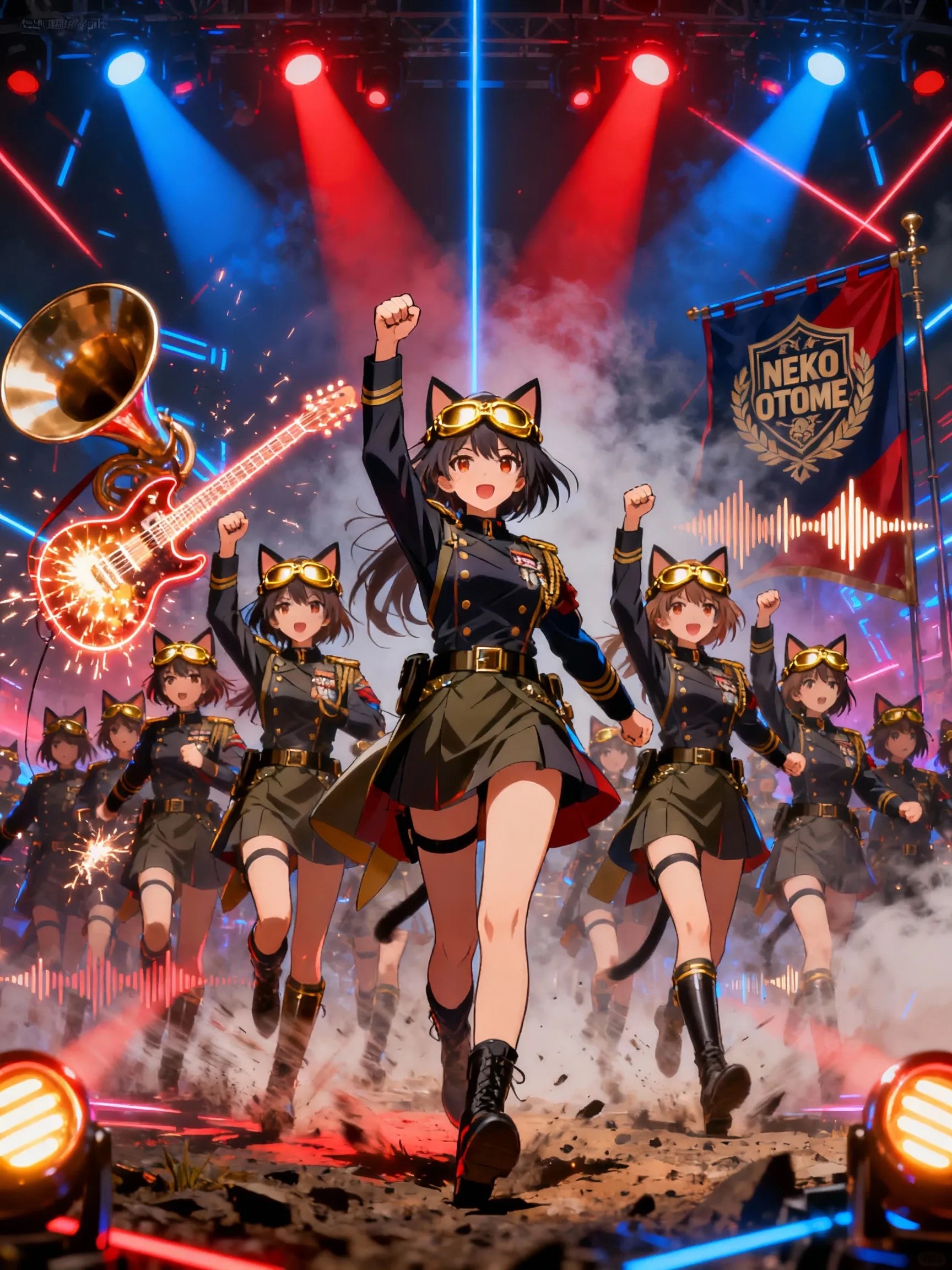 female vocal-driven aggressive Military New Wave J-Rock with heavy distortion twin guitars, slap bass groove, powerful double-kick drumming with rapid fills, sharp synthesizer leads for cinematic layering, tempo 160bpm, husky yet transparent female vocals, anthem-like melodic chorus, dynamic build-ups, dramatic key changes, live band sound with military rock influences, each instrument clearly separated in mix: lead electric guitar (white cat maiden), slap bass (black cat maiden), high-energy drums (gatekeeper cat), synthesizer pads and leads for atmosphere, powerful layered chorus vocals, no male vocals, no shouting, no harsh screams, no growl, Theme: 號天 - roaring to the heavens, uniting strength, breaking through the sky with unstoppable energy, live concert battlefield]