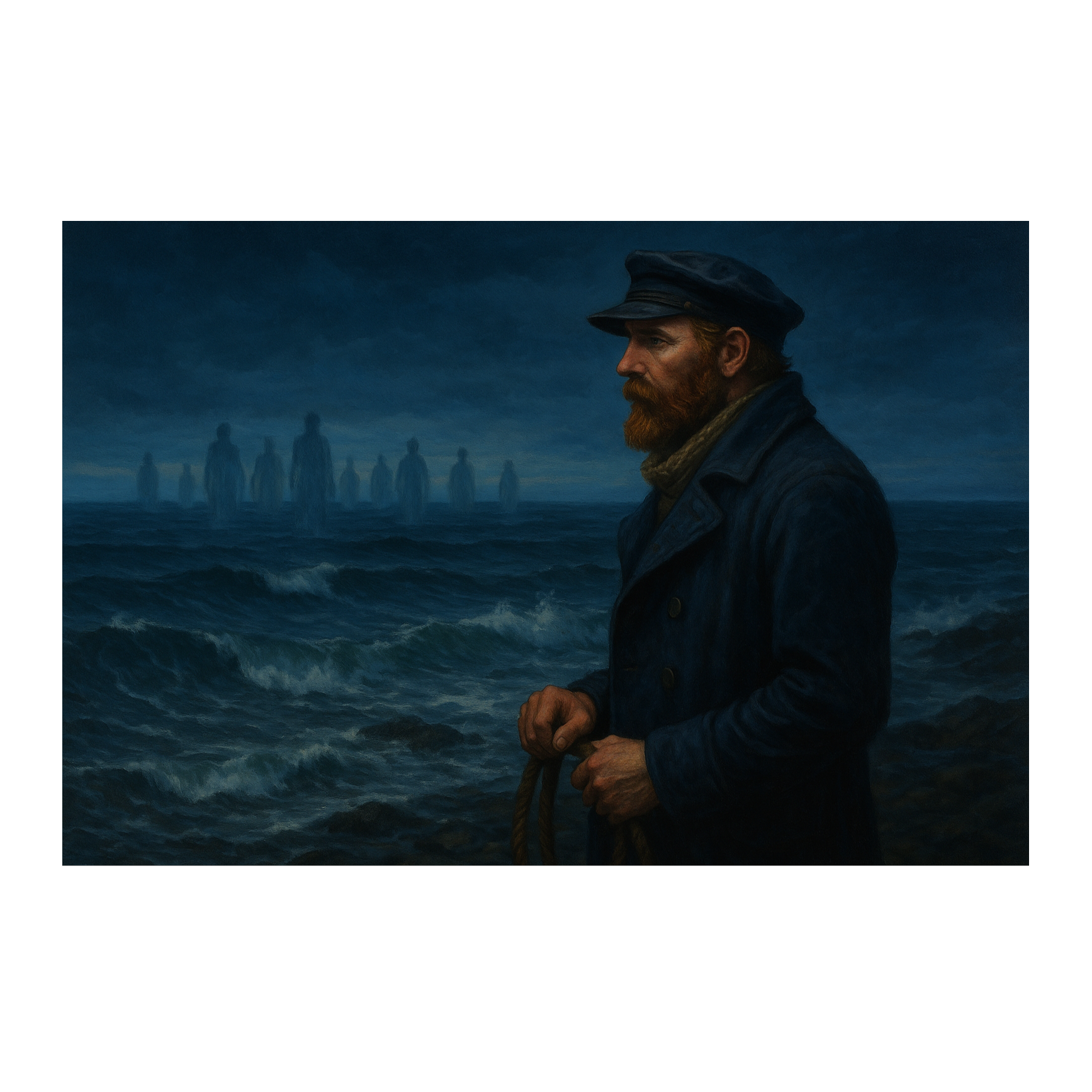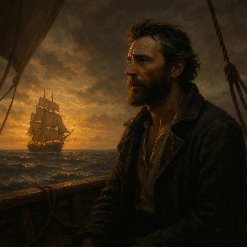 Sea-folk anthem rooted in Fo’c’sle songs and fore-bitters, reimagined with cinematic folk-rock energy, Male lead vocals carry a strong, melancholic British tone, alternating between intimate storytelling and rousing unison choruses, Old World instruments — concertina, melodeon, fiddle, banjo, mandolin, tinwhistle, flute, harmonica, tambourine, bodhrán, and bones — weave into a layered ensemble, raw and timeless, Banjo arpeggios and mandolin strums form the reflective base, with fiddle drones and whistles adding mournful color, Percussion from bodhrán, tambourine, and bones drives momentum, echoing shipboard work songs, Choruses erupt in chant-like power, uniting voices like sailors heaving at sea, Production emphasizes organic reverb, acoustic warmth, and live-room intensity, conjuring the sound of instruments and voices rising in a tavern or on a storm-tossed deck, A sweeping historic folk epic — authentic yet revitalized, full of grit, unity, and anthemic lift
