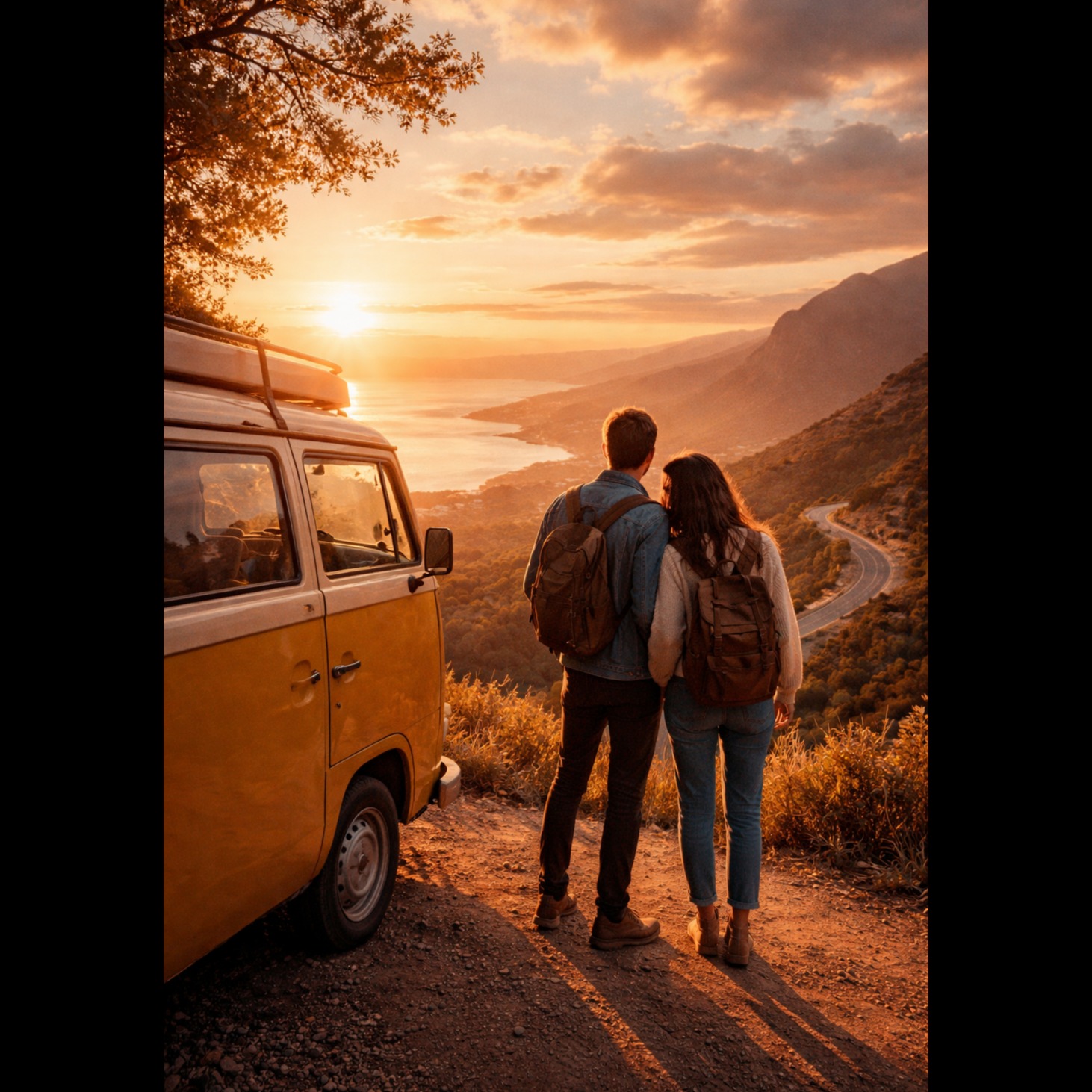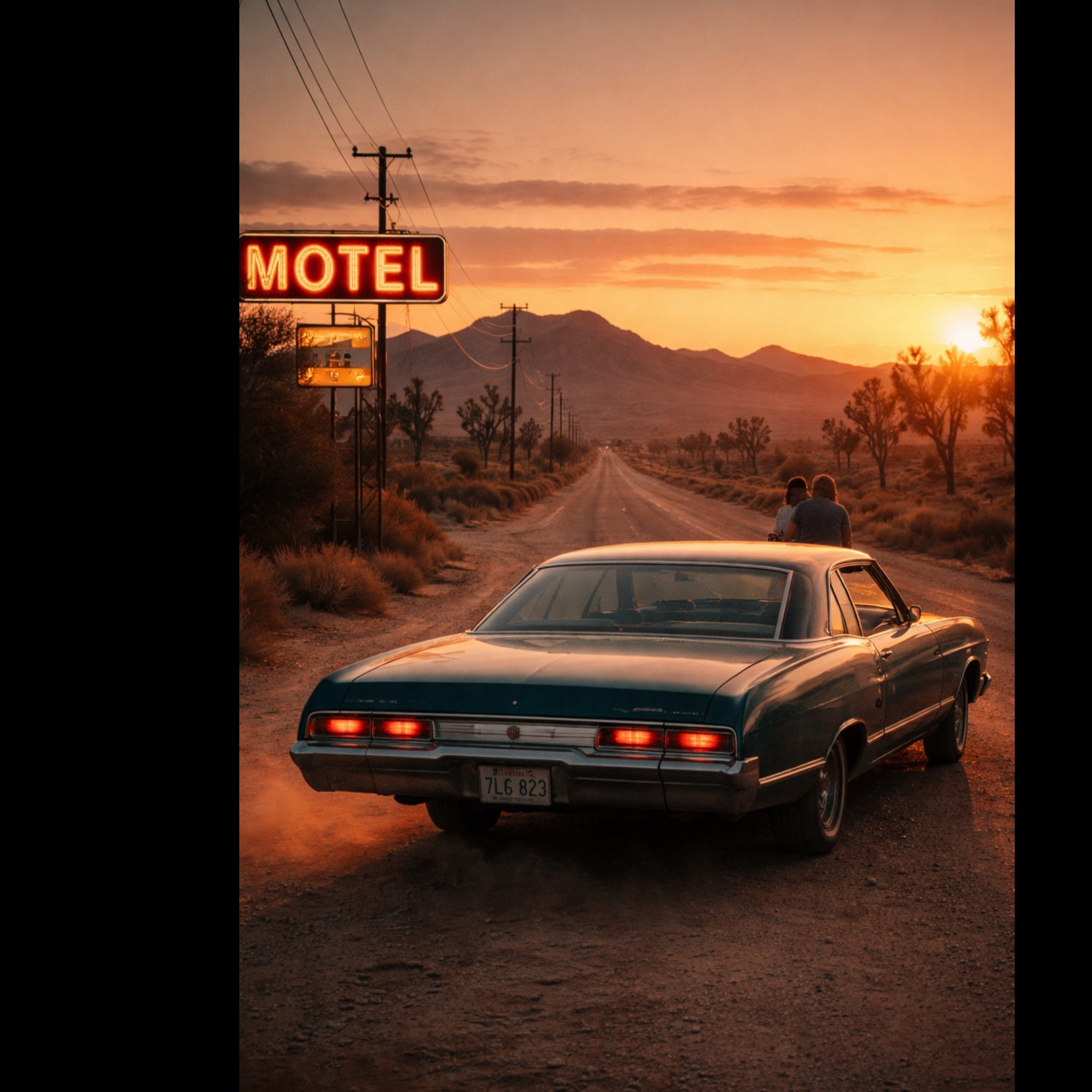 Folk américain indépendant, ballade de road trip cinématographique, guitare acoustique en fingerpicking chaleureuse, voix masculine douce et légèrement éraillée, interprétation intime et sincère, tempo lent (78–88 BPM), batterie légère aux balais, harmonica discret en arrière-plan, basse ronde et profonde, ambiance nostalgique de coucher de soleil dans le désert, production organique et analogique, reverb naturelle et ample, montée émotionnelle progressive, chœurs aériens subtils dans le dernier refrain, arrangement minimal mais immersif