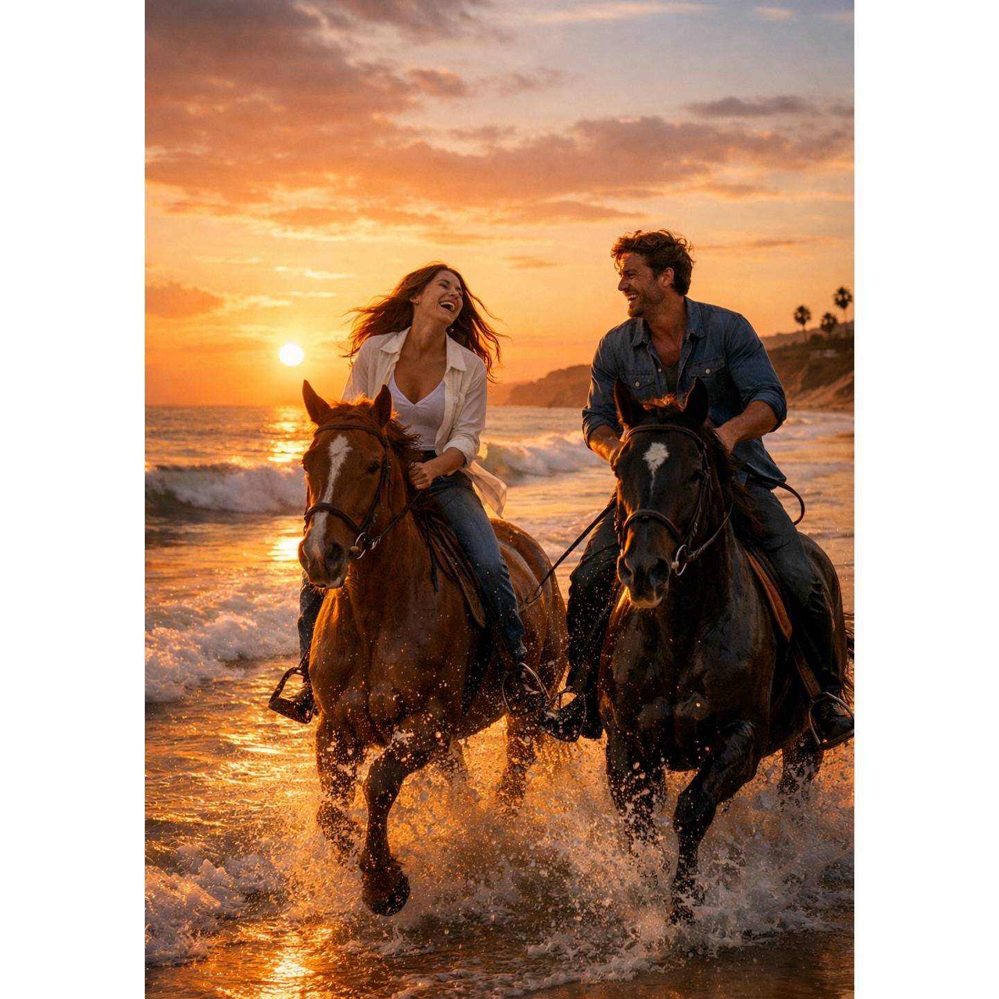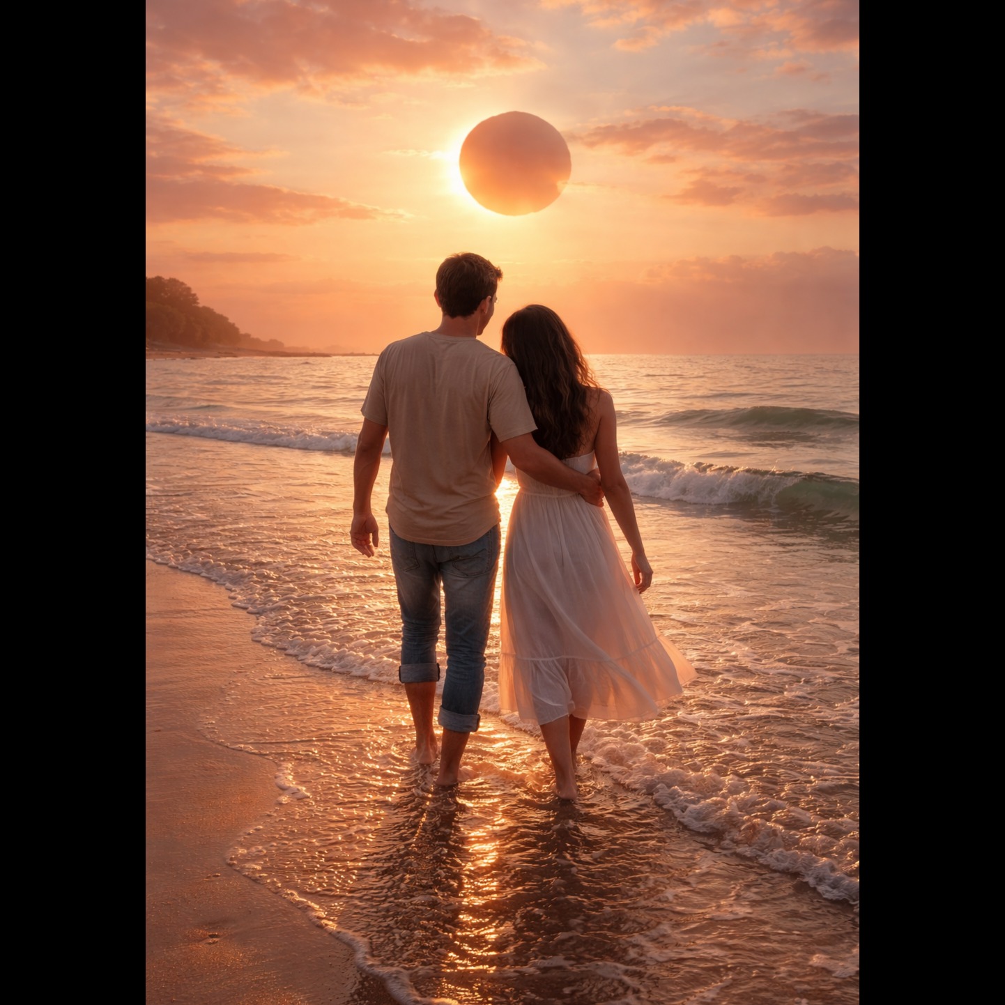 Indie cinematic pop ballad, sunrise on a calm beach, couple walking in shallow water, anticipation before a solar eclipse, emotional male and female duet, deep raspy male voice, soft airy female voice, alternating verses, harmonized chorus, acoustic guitar arpeggios, soft piano, subtle heartbeat percussion, airy pads, gradual build to powerful final chorus, warm bass, immersive atmosphere, inspirational and romantic tone
