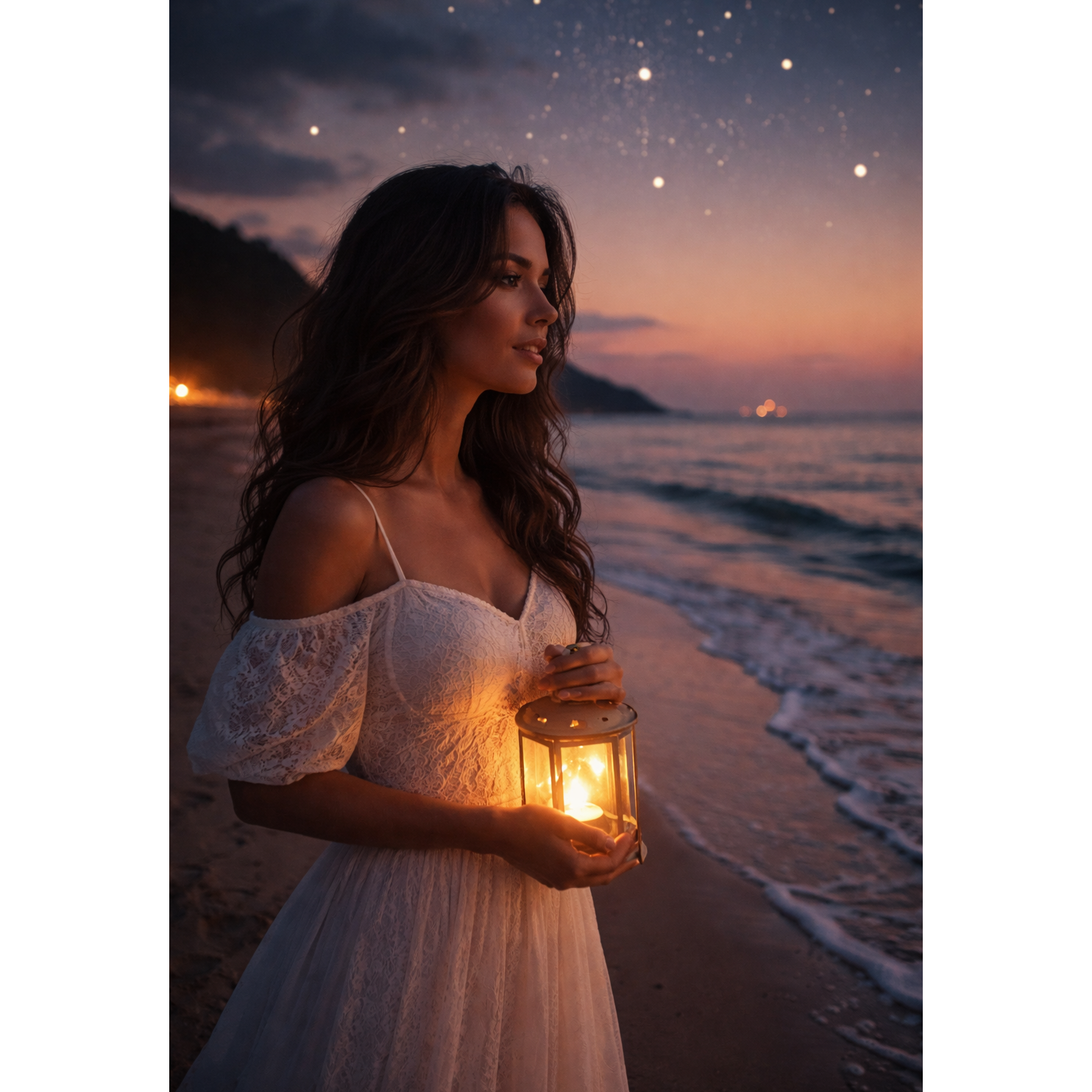 Pop romantique / Afro-pop douce & contemplative — Tempo lent (~70–80 BPM), guitare acoustique légère en arpèges, piano minimaliste et nappes de cordes subtiles, voix féminine claire et intime en solo avec harmonies légères sur le refrain, ambiance rêveuse et chaleureuse rappelant une soirée au bord de la mer, étoiles scintillantes et légère brise en arrière-plan, émotion douce et aérienne