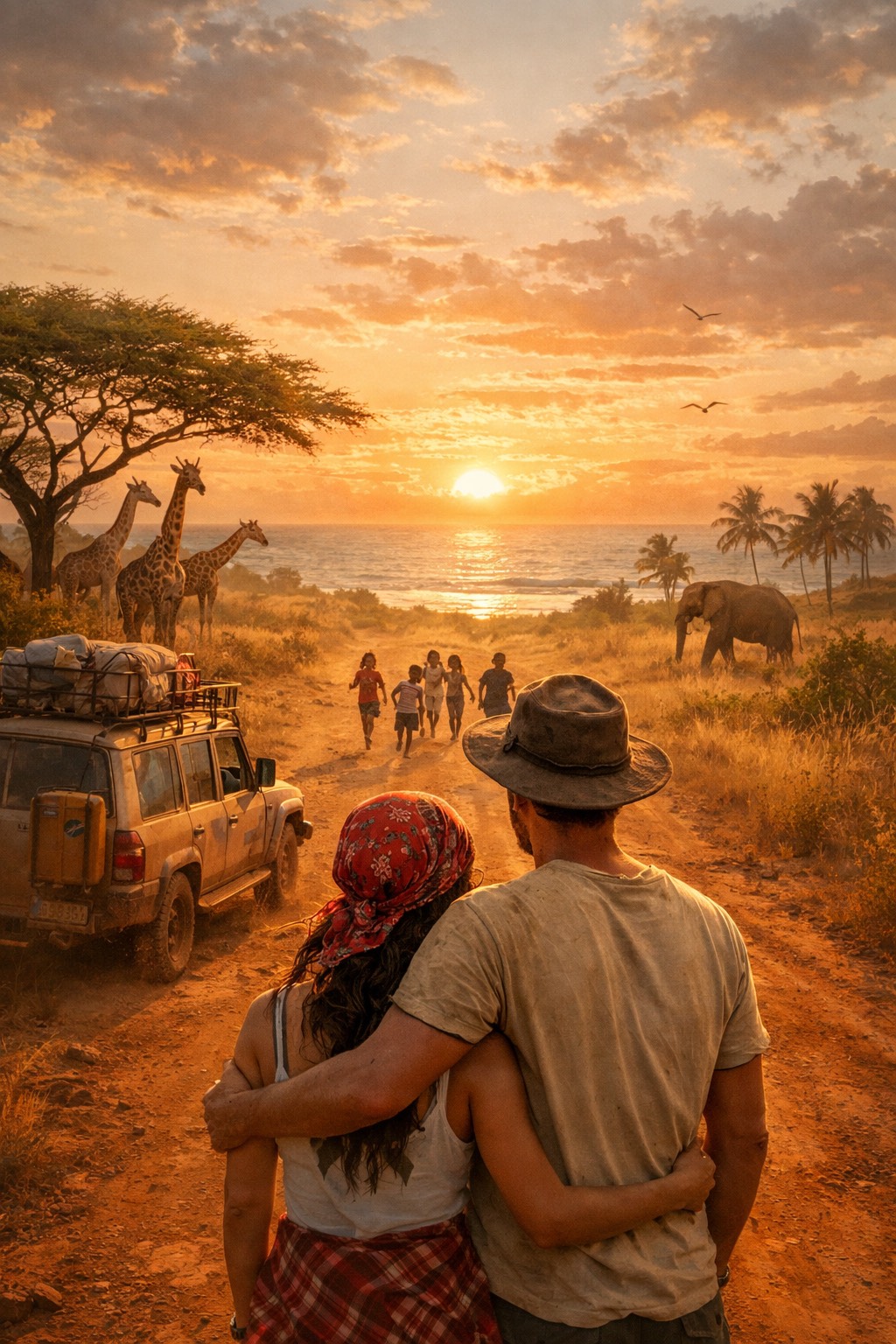 Warm African road trip song, acoustic folk with afrobeat influences, uplifting and emotional, Male vocal, warm and expressive voice, Acoustic guitar as main instrument, with light African percussion, shakers, hand drums and soft bass, Relaxed groove around 95 BPM, Atmosphere of travel, freedom and sunshine, Choir of children in the background during the chorus, Cinematic feeling of adventure across savanna, villages and ocean sunset, Positive, hopeful and heartfelt mood