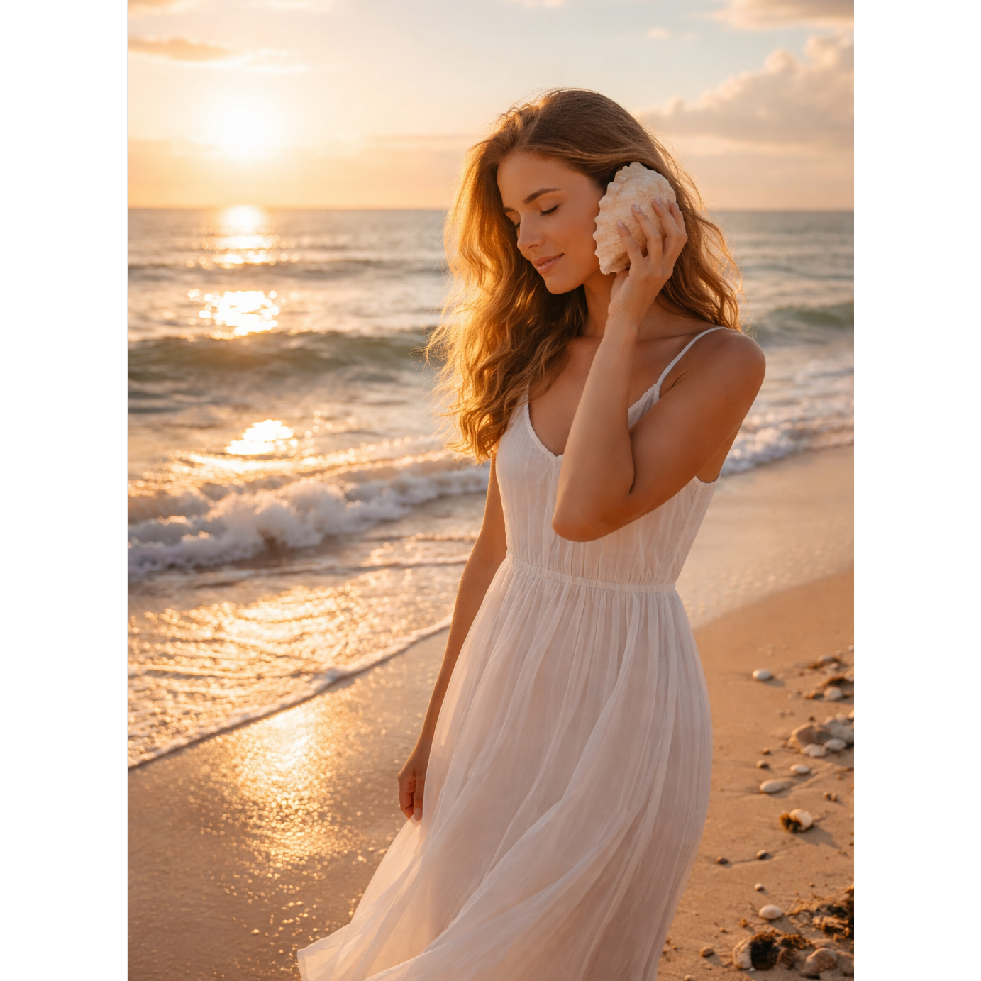 Folk / Indie Pop océanique et apaisant — Tempo lent à modéré (~66–72 BPM), guitare acoustique légère en arpèges fluides, piano doux en accords ouverts, pads atmosphériques subtils pour évoquer l’horizon et l’espace marin, basse ronde et discrète soutenant délicatement la progression, percussions très fines et organiques (shaker léger, kick feutré, textures naturelles rappelant le ressac), Voix féminine chaleureuse, intime et lumineuse, proche du micro dans les couplets, légèrement plus ouverte et enveloppante dans le refrain, harmonies aériennes discrètes pour créer une sensation de flotter, Réverbération douce et large pour rappeler l’espace de la mer, Ambiance : plage dorée au lever ou coucher du soleil, coquillage à l’oreille, mer calme, esprit apaisé, sensation de liberté et d’appel du large, Thème sonore : sérénité, respiration, connexion à l’océan, lâcher-prise et paix intérieure