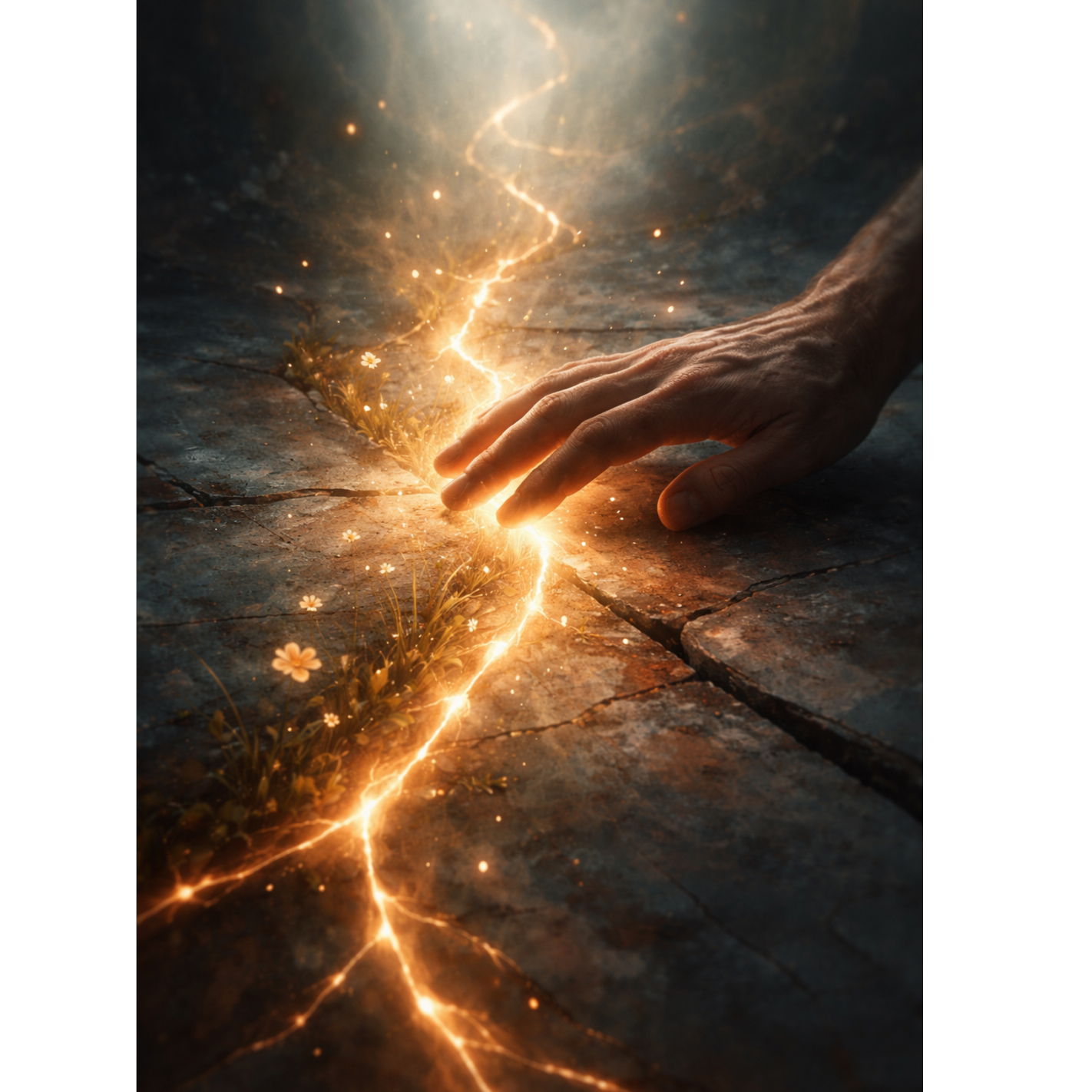 Rock alternatif sombre et introspectif — Tempo modéré (~90 BPM), guitares électriques puissantes avec riffs mélodiques dans les couplets et accords ouverts et saturés dans les refrains, batterie martelée mais organique avec variations dynamiques, basse ronde et présente pour soutenir les riffs, voix masculine expressive, parfois murmurée dans les passages calmes, refrains larges et ouverts avec intensité émotionnelle, ambiance sombre, viscérale et introspective mais porteuse d’espoir, thème : avancer malgré le chaos, se tenir debout face aux épreuves, lumière intérieure fragile mais persistante, résilience silencieuse, contraste entre tension dans les couplets et libération dans les refrains, atmosphère contemplative et puissante, énergie rock mais poétique