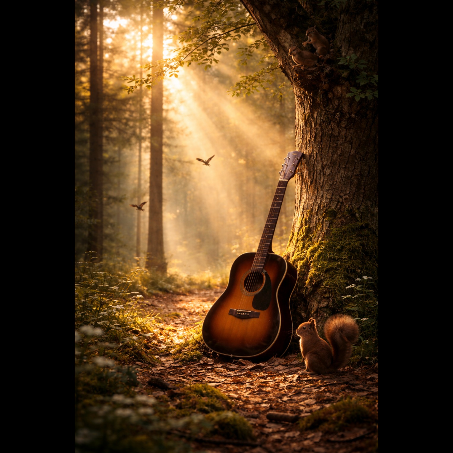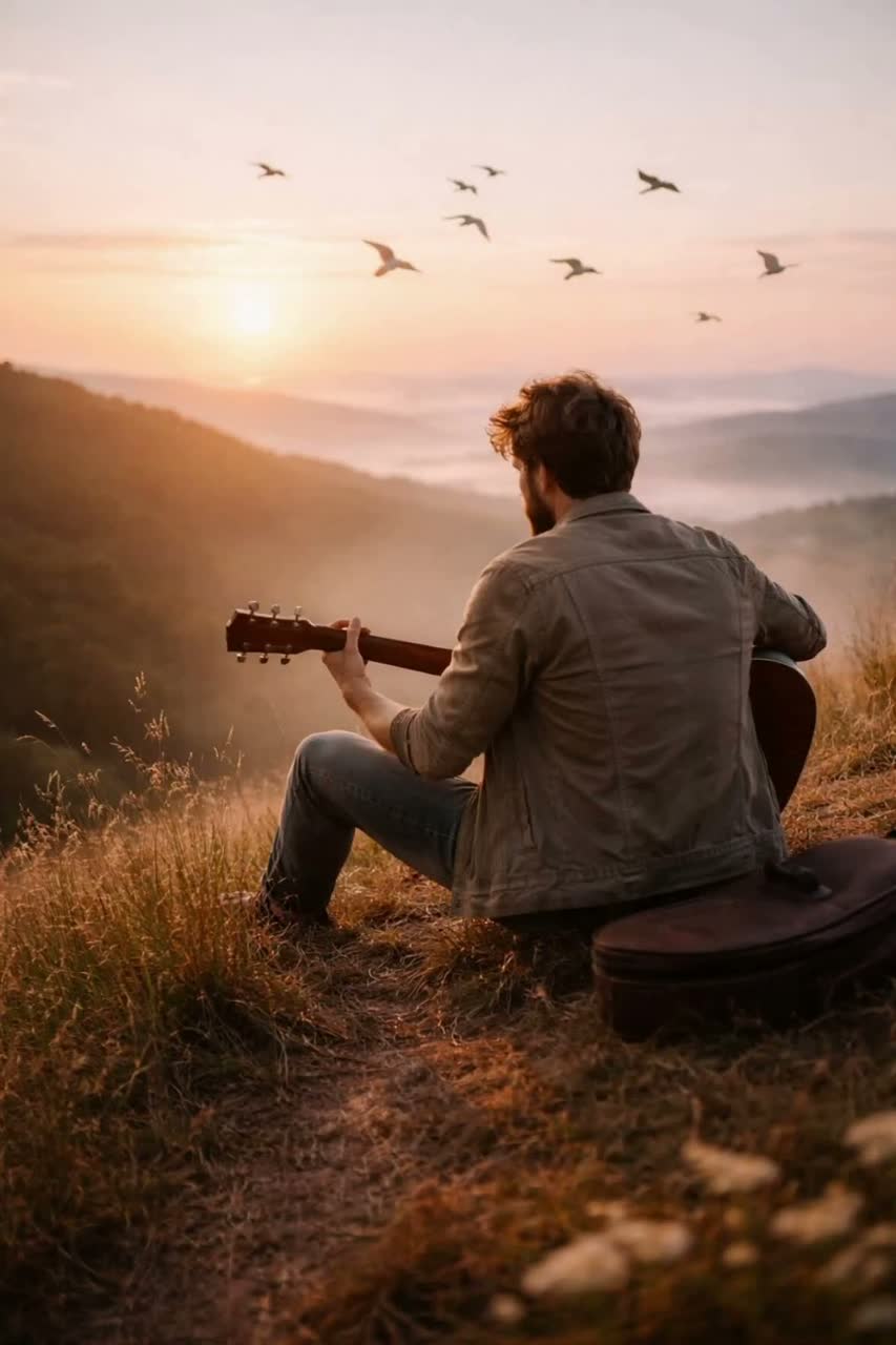 Folk acoustique pur / Solo Fingerpicking intime — Tempo modéré (~68–72 BPM), guitare acoustique seule en fingerpicking clair et précis avec notes bien distinctes et séparées, alternance entre basses profondes jouées au pouce et mélodie cristalline sur les cordes aiguës, dynamique naturelle et organique, légers glissements de doigts audibles pour plus d’authenticité, Aucun autre instrument, aucune percussion, aucune basse additionnelle, Son chaud, proche du micro, captation intime mettant en valeur la résonance du bois et la texture des cordes, Voix féminine douce et narrative, très proche du micro, interprétation sincère et contemplative dans les couplets, légèrement plus ouverte dans le refrain sans perdre l’intimité, Légère réverb naturelle et subtile pour évoquer l’espace d’une colline au lever du soleil, Ambiance : matin doré, chemin poussiéreux, horizon ouvert, liberté simple et paisible