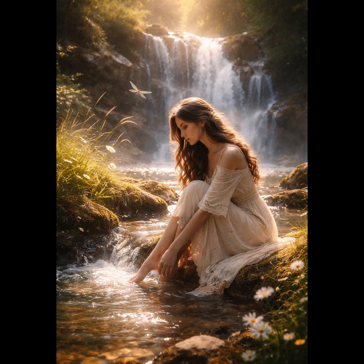 Folk atmosphérique cinématographique, voix féminine douce et émotive, interprétation intime et sensible, guitare acoustique en arpèges délicats, piano ambiant avec réverbération profonde, cordes légères et aériennes, percussions très douces, ambiance sonore de rivière en arrière-plan, tempo lent 80 BPM, montée progressive vers un refrain puissant et libérateur, harmonies éthérées, production organique et chaleureuse, grande sensation d’espace, ambiance introspective et apaisante