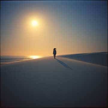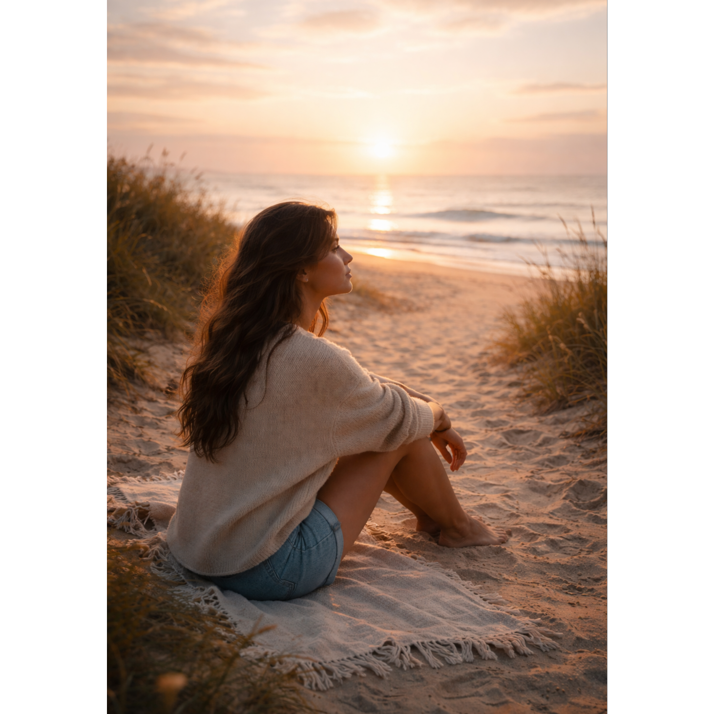 Indie folk acoustique doux et poétique, voix féminine intime et chaleureuse, guitare acoustique aux arpèges légers, piano délicat ponctuant les mots clés, percussions discrètes et subtiles, basse douce pour la profondeur, sons atmosphériques de vent et vagues très légers, tempo lent et respirant, ambiance apaisante, rêveuse et contemplative, inspirée par une promenade sur les dunes au bord de la mer au crépuscule, avec un souffle de nostalgie et de tendresse