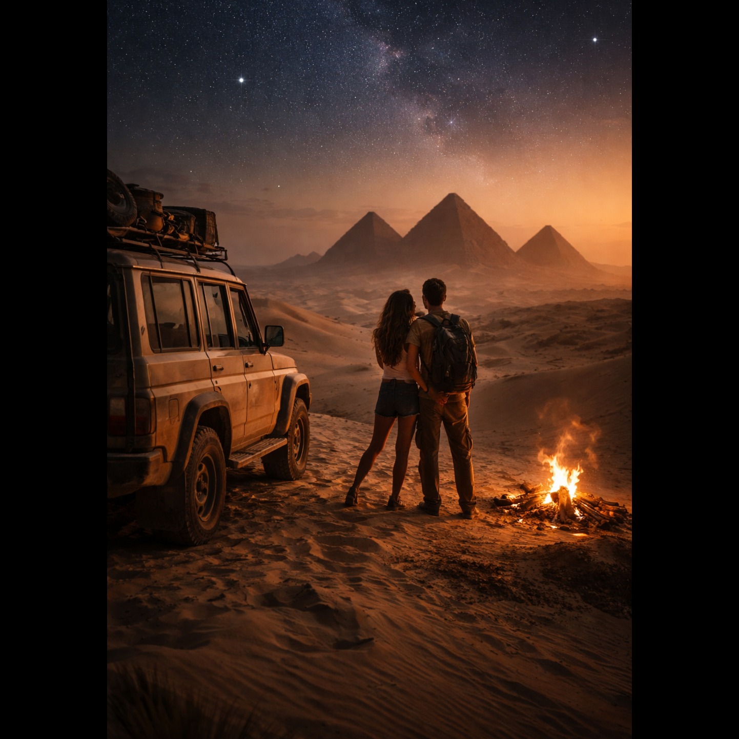 cinematic desert road trip song, female emotional vocals, atmospheric Egyptian desert night, acoustic guitar and oud melodies, soft darbuka percussion, ambient synth pads, mysterious ancient tombs vibe, feeling of freedom and adventure, warm desert wind atmosphere, cinematic build up and powerful emotional chorus, indie world music, 90 bpm