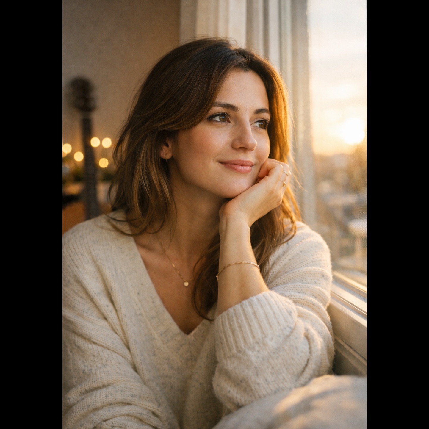 Folk / Intime et chaleureux — Tempo modéré (~65–72 BPM), guitare acoustique douce en arpèges ou accords ouverts, piano minimaliste pour ponctuer les émotions, basse légère et ronde soutenant la mélodie sans la dominer, percussions fines avec brushes ou shakers très subtils pour garder le calme et l’intimité, Voix féminine proche du micro, chaleureuse, intime et sincère, respirations audibles pour renforcer la proximité et la fragilité contrôlée, harmonies légères dans les refrains pour créer une sensation de douceur et de sécurité